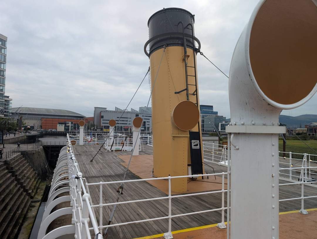 I stayed in the campervan watching everything, while Daddy Edu and Uncle Javi went to see the Titanic Experience. From what I understood, it's a huge museum dedicated to the famous ship: its construction in the Harland & Wolff shipyards, the stories of the passengers and even models where you can imagine yourself walking through its halls before the final plunge. They also went into the SS Nomadic, a much smaller but historic boat: it was the ferry that took passengers from land to the Titanic itself. Come on, the most famous maritime taxi in the world.