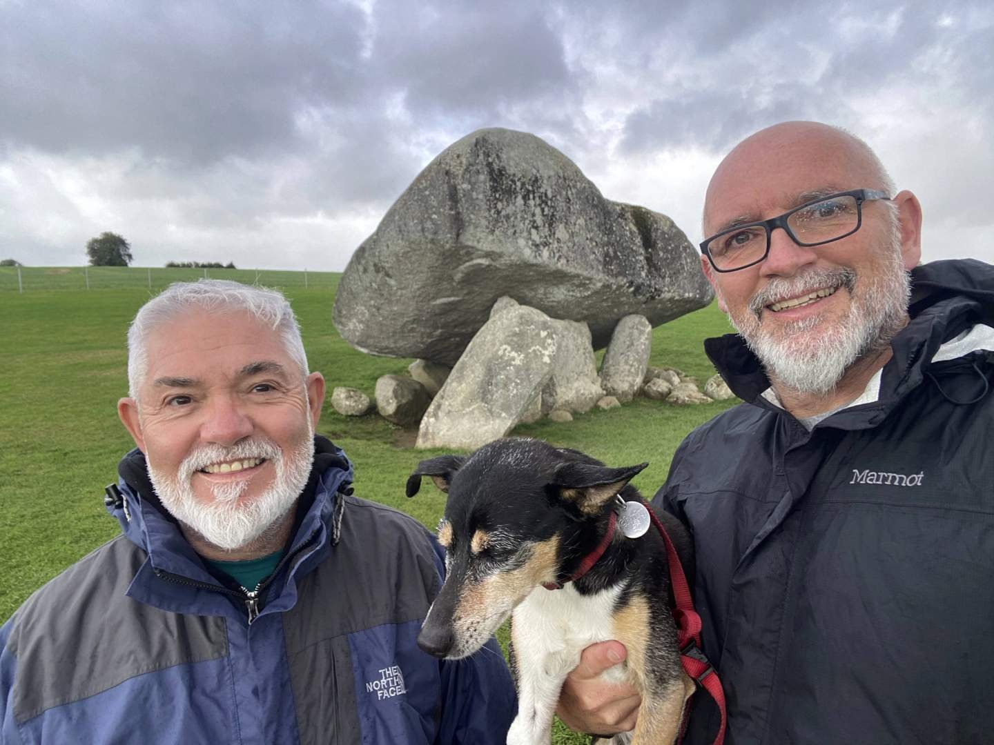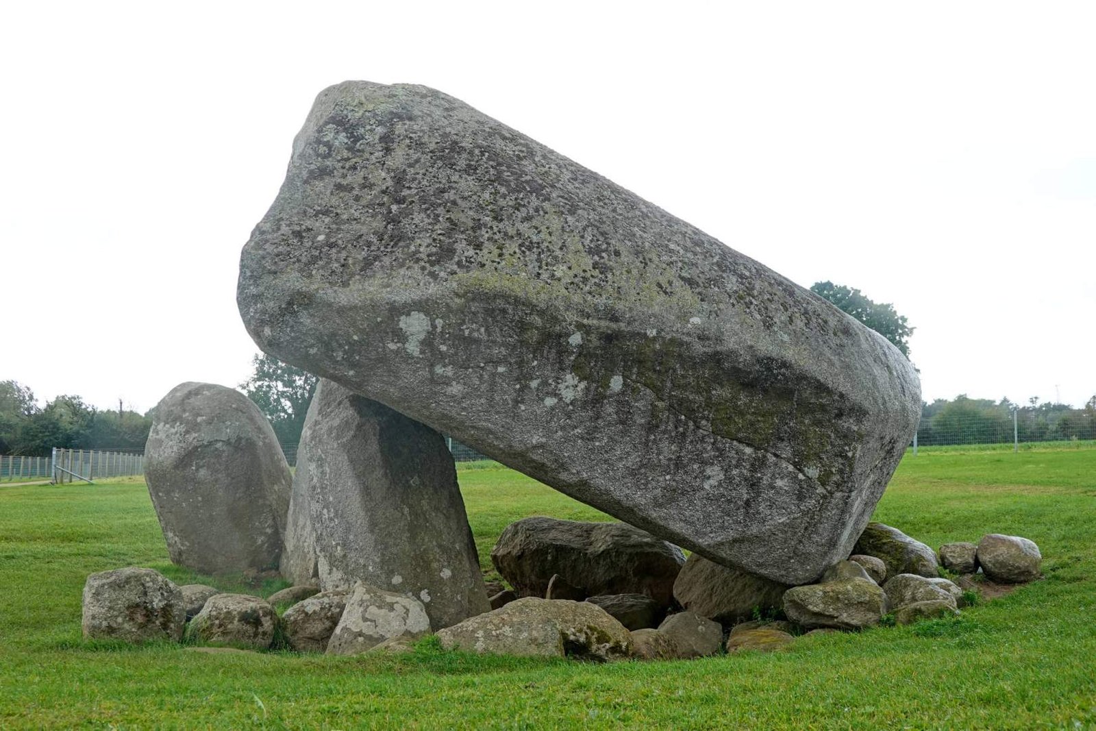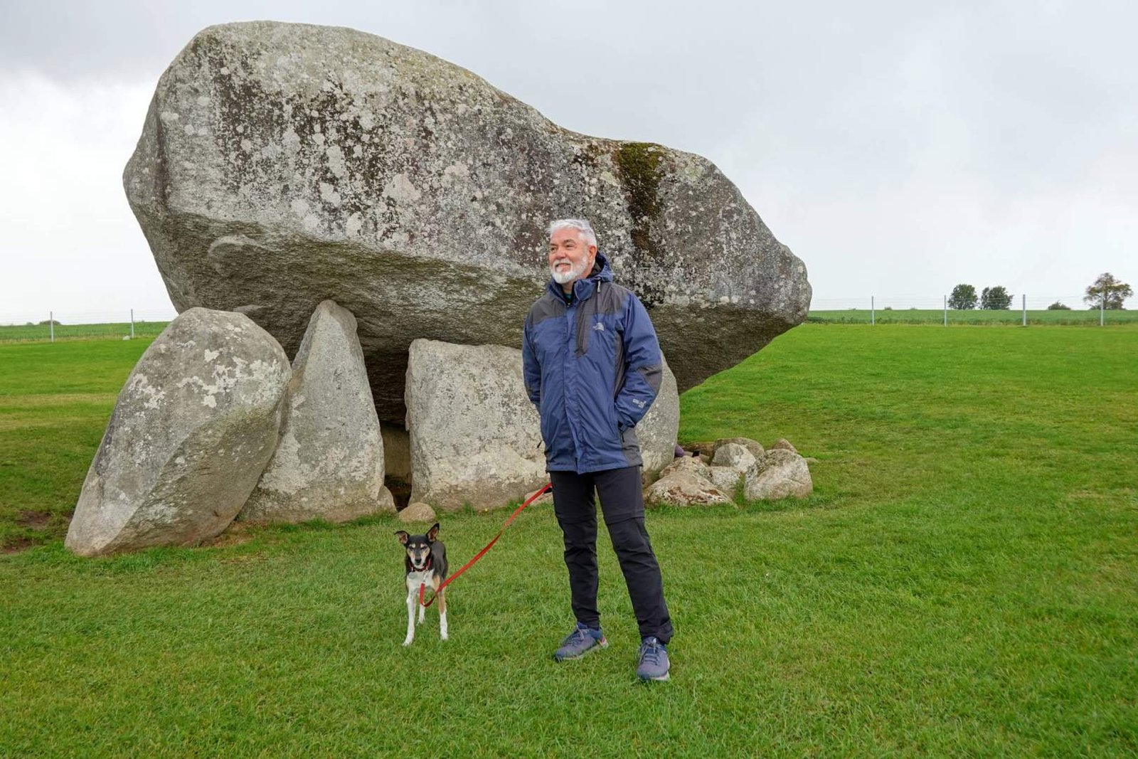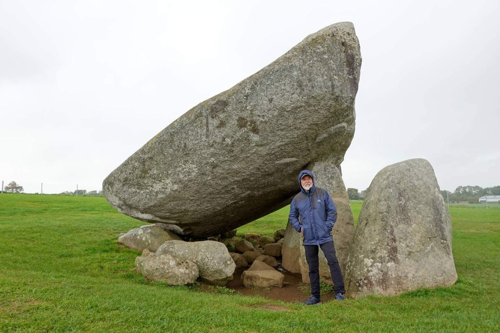 We went out almost at one in the afternoon, when we couldn't turn around inside any more. In about fifteen minutes we arrived at the Brownshill Portal Tomb dolmen. We parked and walked there, about a five-minute walk in the rain. And there it was: a mass of stone that seems impossible that humans from more than five thousand years ago could have placed without cranes or excavators. The upper block weighs more than one hundred and fifty tons, which is equivalent to thousands of ox bones, and yet it is still there, resting on its stones as if nothing. They say it served as a tomb, but I suspect it was also a deluxe dog house for some tribal chief. We took photos, selfies, and I even tried to pose with my best "doggy archaeologist" face.