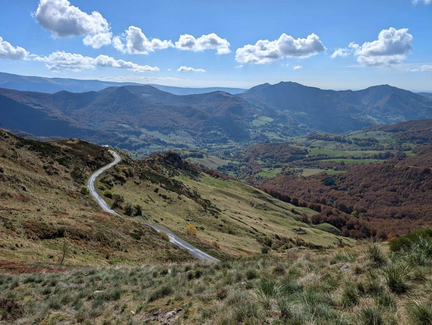 After an hour, forty photos and zero sausages offered, we went back to the car. Destination? The same way back to the Puy Mary. Third time in less than twenty-four hours, I almost greet each bend by name. But this time instead of staying up there, we crossed to the other side via the Col de Serre, another beautiful pass, with views of sloping meadows and cows that seem to know Latin.
