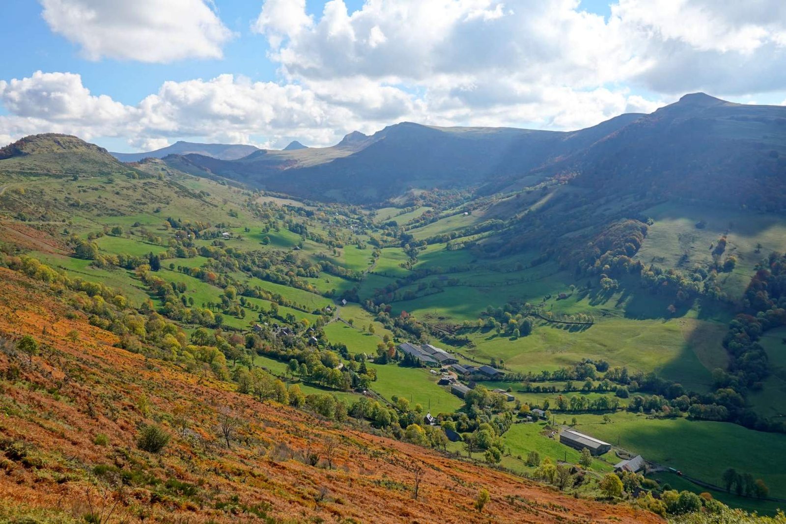 And then the panoramic car tour began: Le Claux, Cheylade, Laveissière… small villages, so quiet that if I bark I wake up the whole town hall. We didn't stop, but the roads looked like a cartoon: gentle green hills, meadows with happy cows, distant peaks, forests here and there, stone houses dotting the landscape and not a single lorry breaking the spell. I almost feel like wearing a beret.