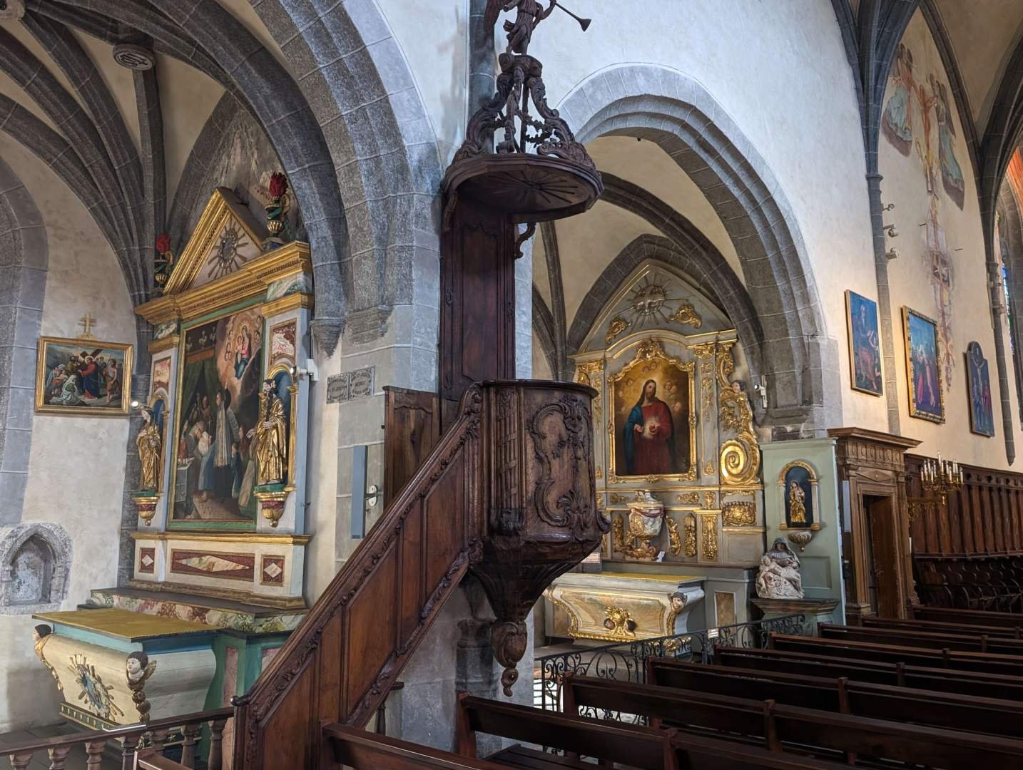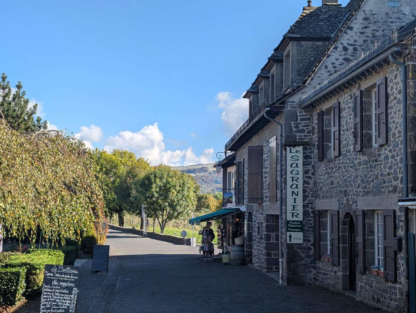 We parked for free in front of a small church, Notre Dame de Lorette, because the city centre car park wanted money and we preferred to spend it on croquettes (for me) and bread (for him). We explored Salers on foot, which turns out to be on the list of "most beautiful villages in France". And this time they're not lying, eh? Cobbled streets, dark volcanic stone houses, balconies, turrets, not a bin out of place, elegant silence… and views of meadows that looked like they came straight out of a cheese advert. I sniffed every corner and took a mental photo of three cats that ignored me.