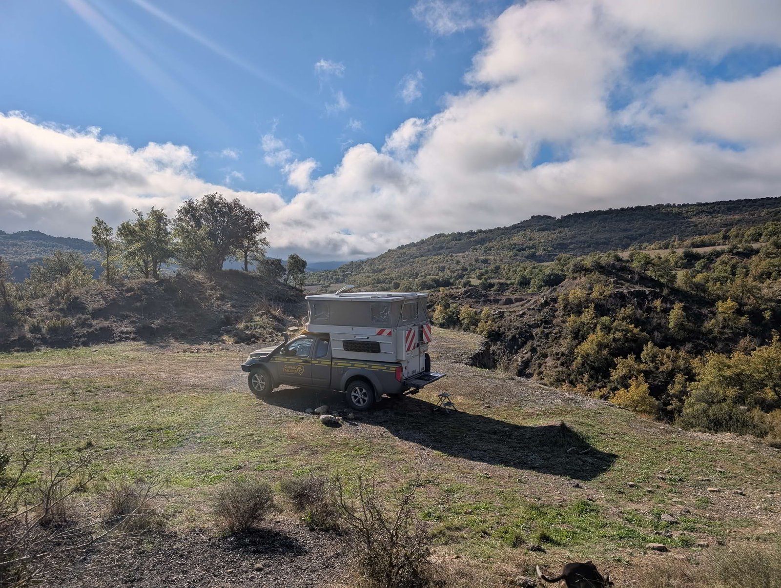 So Daddy looked on the map and found a promising place near Puente de Montañana. We went up a gravel road that seemed forgotten by humans but perfectly designed for our camper. And there we found it: a corner in the middle of nowhere, with wide views and absolute silence, except for the murmur of the wind. A place to stay, although the rain soon returned, as if it was following us wherever we go.