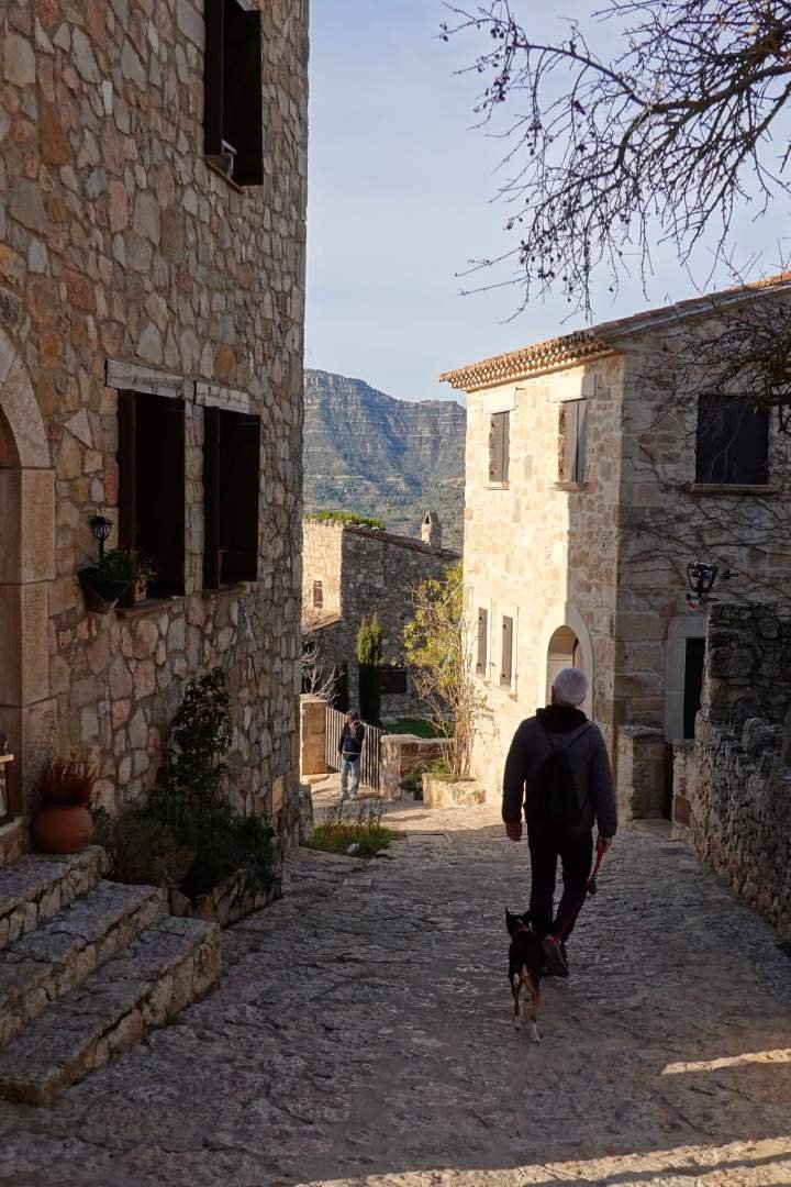 Then we continued by car to Siurana, the village described as "hanging" because of its location on a steep cliff with incredible views of the Siurana reservoir and the valley. There were a lot of people and the paid parking was full of tourist cars, so the experience was a bit... crowded. We walked through what are basically the three main streets of the village and saw its church, but not much more. Maybe I, Chuly, the travelling dog, have already seen so many spectacular views that a village with a lot of people and few mysterious shadows doesn't impress me as much as before.