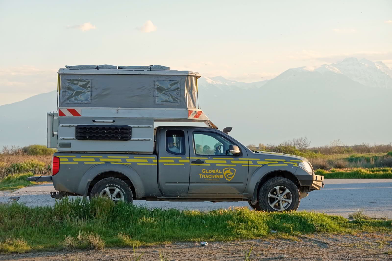 Cuando el sol empezó a bajar, volvimos hacia a la cámper. Aquí la costa mira al este, así que la puesta es sobre tierra, lo cual es un poco raro, pero tiene su punto. Detrás de la playa hay una zona natural tipo pantano, justo al lado del aparcamiento. Resultado: mosquitos. Muchos. Más de los que uno puede gestionar con dignidad. Tuvimos que refugiarnos en la camper bastante rápido, porque aquello era peor que intentar dormir con una mosca en la oreja. Pero bueno, dentro estamos bien. El sitio es tranquilo, hay espacio y la playa ahí delante lo compensa todo. Así que aquí nos quedamos a dormir. Arena, mosquitos y Monte Olimpo de fondo. No es mal combo.