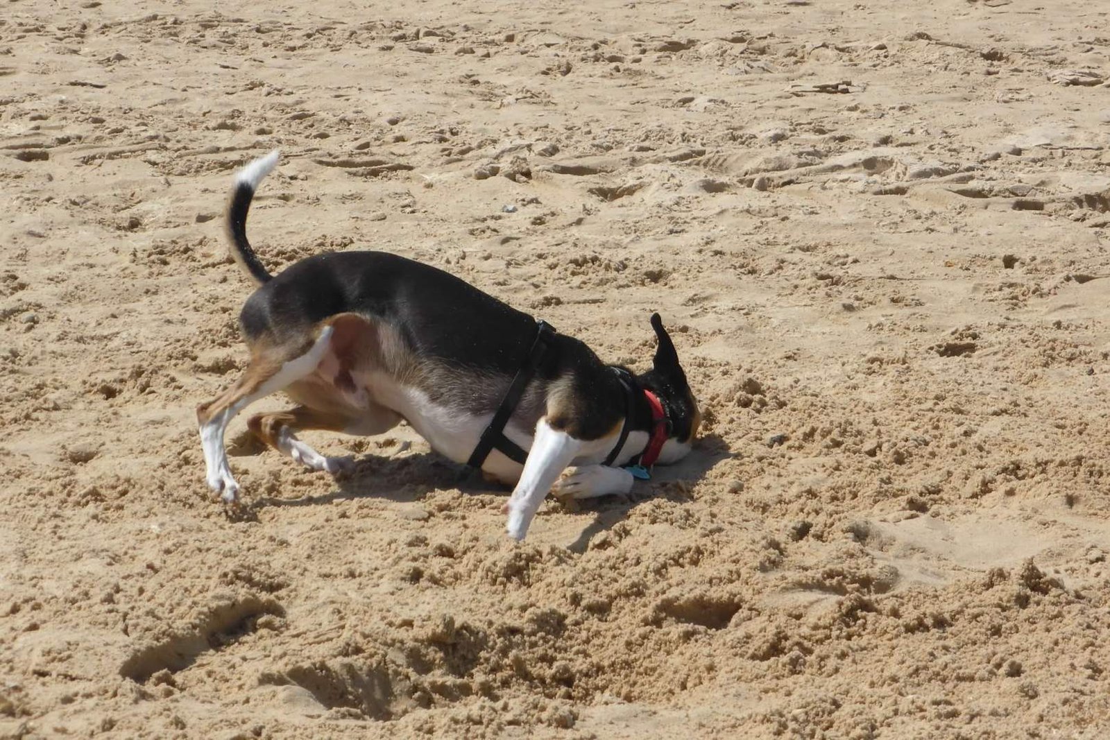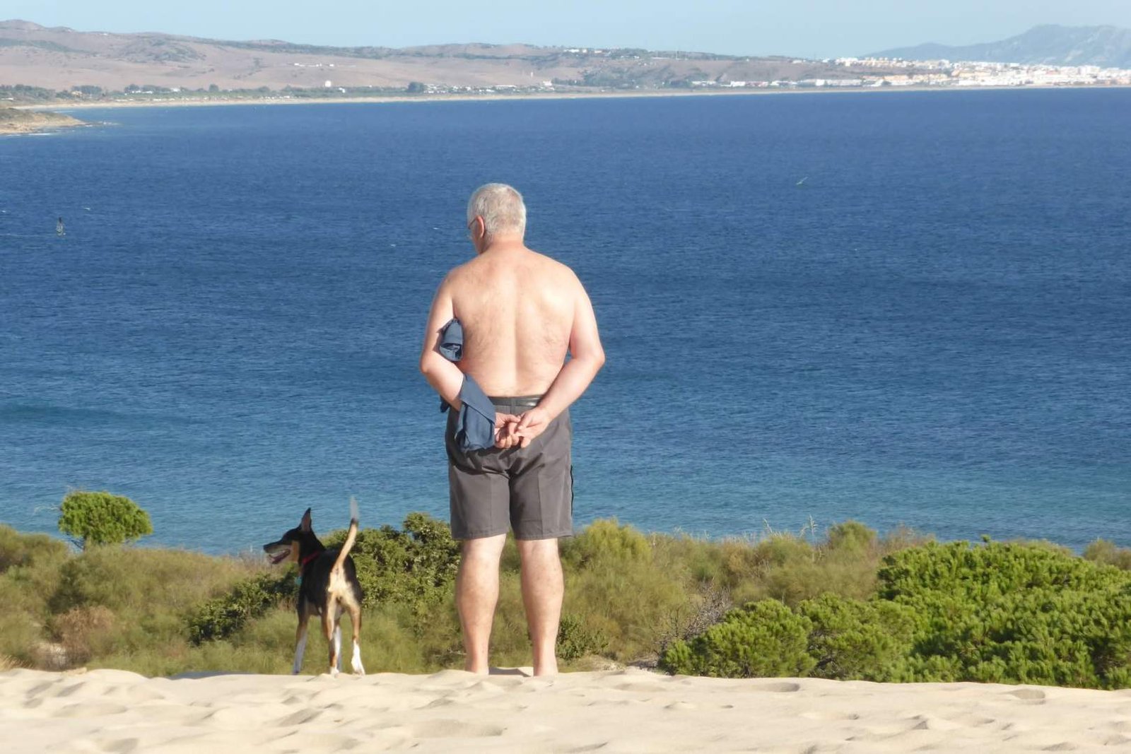 Después llegó lo bueno. Visitamos una duna enorme llamada Punta Paloma. Yo pensé que habría una banda de palomas preparadas para jugar al corre que te pillo. Pero no había ninguna. Ni una sola pluma. A cambio me encontré una playa enorme donde corrí por la arena como si protagonizara un anuncio de pienso premium edición lujo. El viento me movía las orejas y la arena me hacía cosquillas en las patas. Sensación de libertad total.