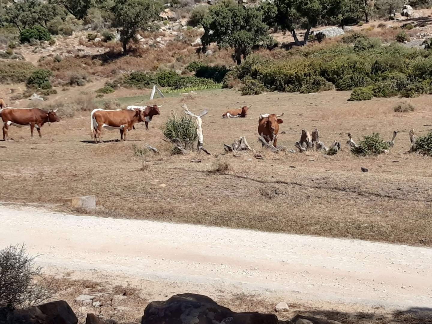 Después del festín, nos adentramos en el campo. Empezamos a subir montañas, con caminos de grava y a veces de cabra... Y ahí, amigos, la cosa se puso emocionante: ¡vacas, cabras, cerditos, canalla y burros por todas partes! Yo no sabía si presentarme o salir corriendo, así que opté por quedarme cerca de papi, por si acaso.