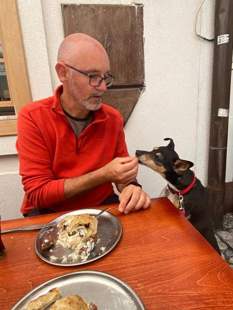 Lo primero que hicimos en el centro fue buscar un sitio para comer. Encontramos un tipo de bar o restaurante en una de esas calles chulas donde por lo visto solo había una cosa en el menú - pan de pita gigante con cevapi (salchichas de carne picada, muy sabrosas). Y un tipo de queso riquísimo. Yo ya había comido en casa pero también pude probar un poco de todo y la verdad es que estaba buenísima.