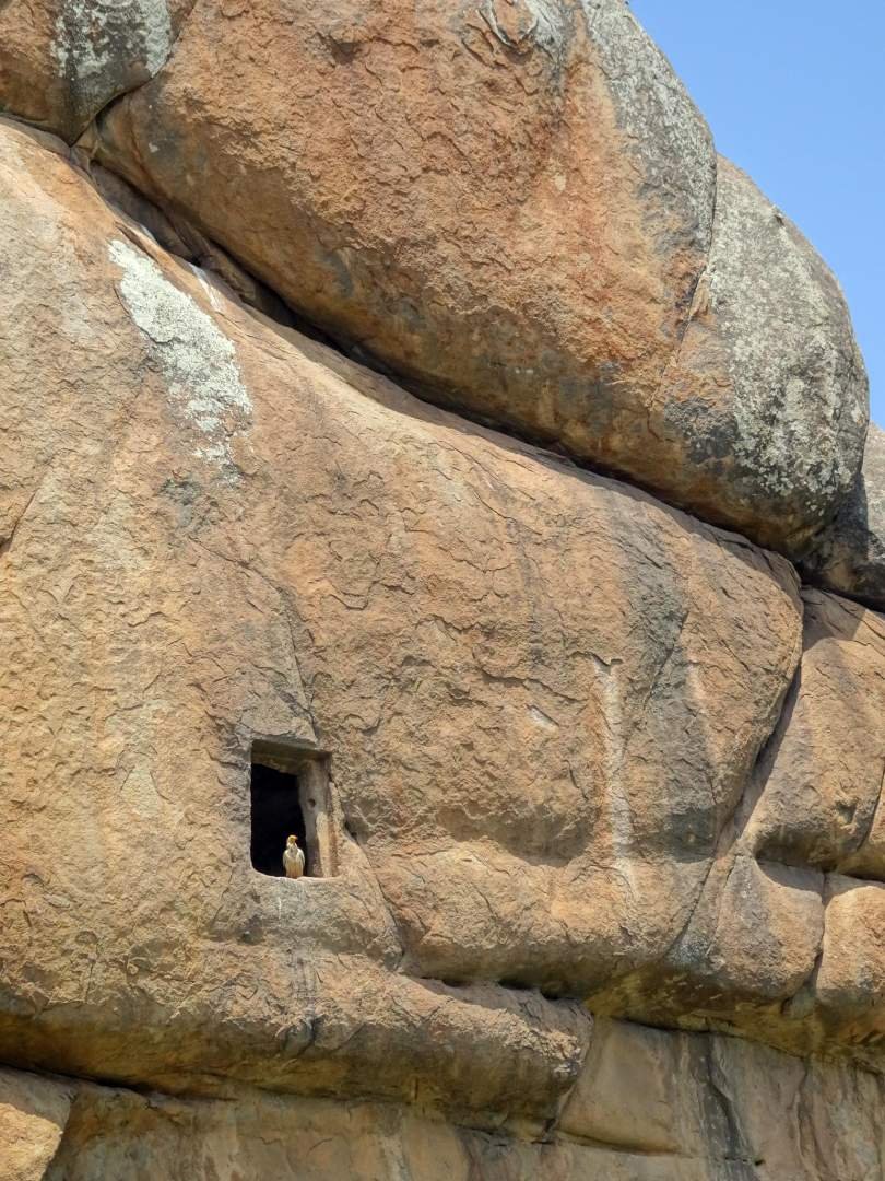 Pensaba que ayer ya había muchos coches y mucha gente en nuestro "camping", pues... durante la noche llegaron muchos más. Resultó que había un evento de escaladas en este lugar y había unas cien tiendas de campaña entre los árboles. Pero visto la cantidad de gente... son todos muy tranquilos y no hacen nade de ruido. Los chicos que están al lado de nuestra cámper hablan un poco de inglés y son muy majos. Mi papi habló un rato con ellos y yo aproveché el buen rollo para pillar algo de su comida. Subimos otra vez a la peña, pero por una ruta diferente. En varios lugares se veía la gente colgada en las rocas, y también vimos un buitre egipcio en su cueva.
