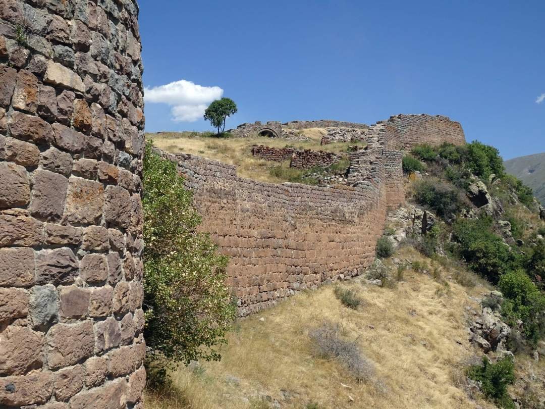 Por la mañana salimos de nuestro lugar de pernocta al lado de la construcción de hierro. Después de ir unos cuantos kilómetros en coche por la carretera buena ya pronto comenzó el jaleo y nos metimos por carreteritas chungas en el valle de Yeghegis, luego más chungas, y al final - ¡ufff! A mi papi le gusta esto, pero esto ya no se puede llamar conducir - es más bien montañismo en coche. No sé cómo pero después de media hora de maltrato del coche y maltrato perruno llegamos a la primera atracción de hoy: la fortaleza de Smbataberd. Tengo que admitir que mereció la pena, porque es bastante chula. En realidad solo son las murallas de un recinto triangular, pero desde allí hay unas vistas increíbles.