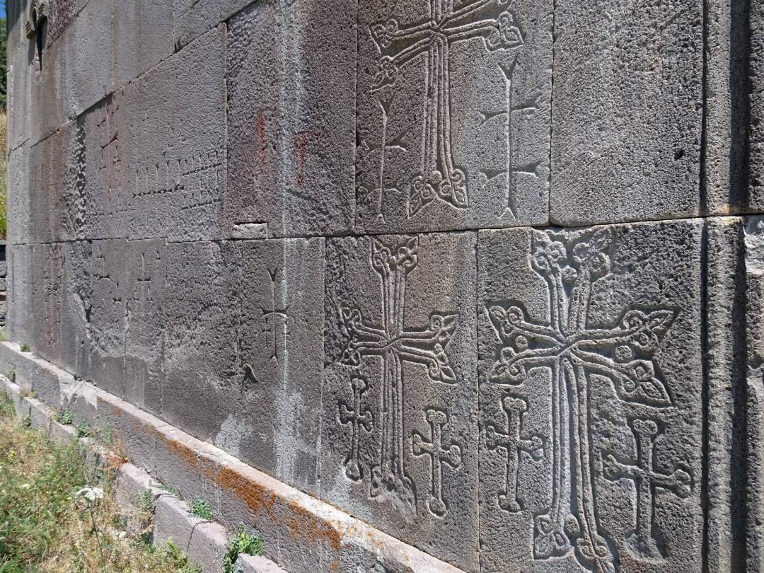 Luego tocó otro trayecto de unos diez kilómetros hacia otra atracción - el monasterio Tsakhatskar. Bajamos por la misma carretera, subimos por otra y - en un momento dado parecía que allí se acabó la ruta, porque había un caballo en el camino que no estaba dispuesto a dejarnos pasar. Cuando mi papi tocó la bocina vino la dueña para reñir al caballo y se lo quitó del medio. El monasterio es como muchas otras - dos iglesias medievales y un montón de lápidas, pero todo esto en un paisaje muy muy bonito. Y allí estábamos a solas. No me extraño, porque no se llega al monasterio con cualquier vehículo.