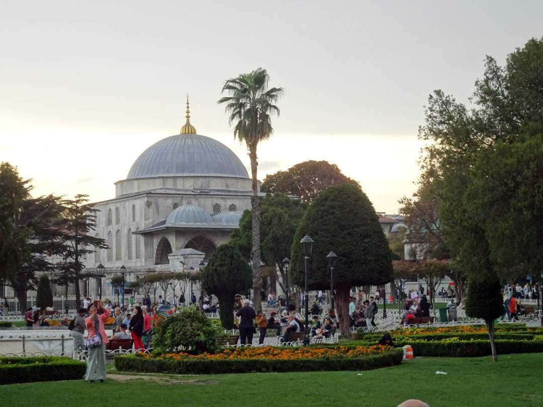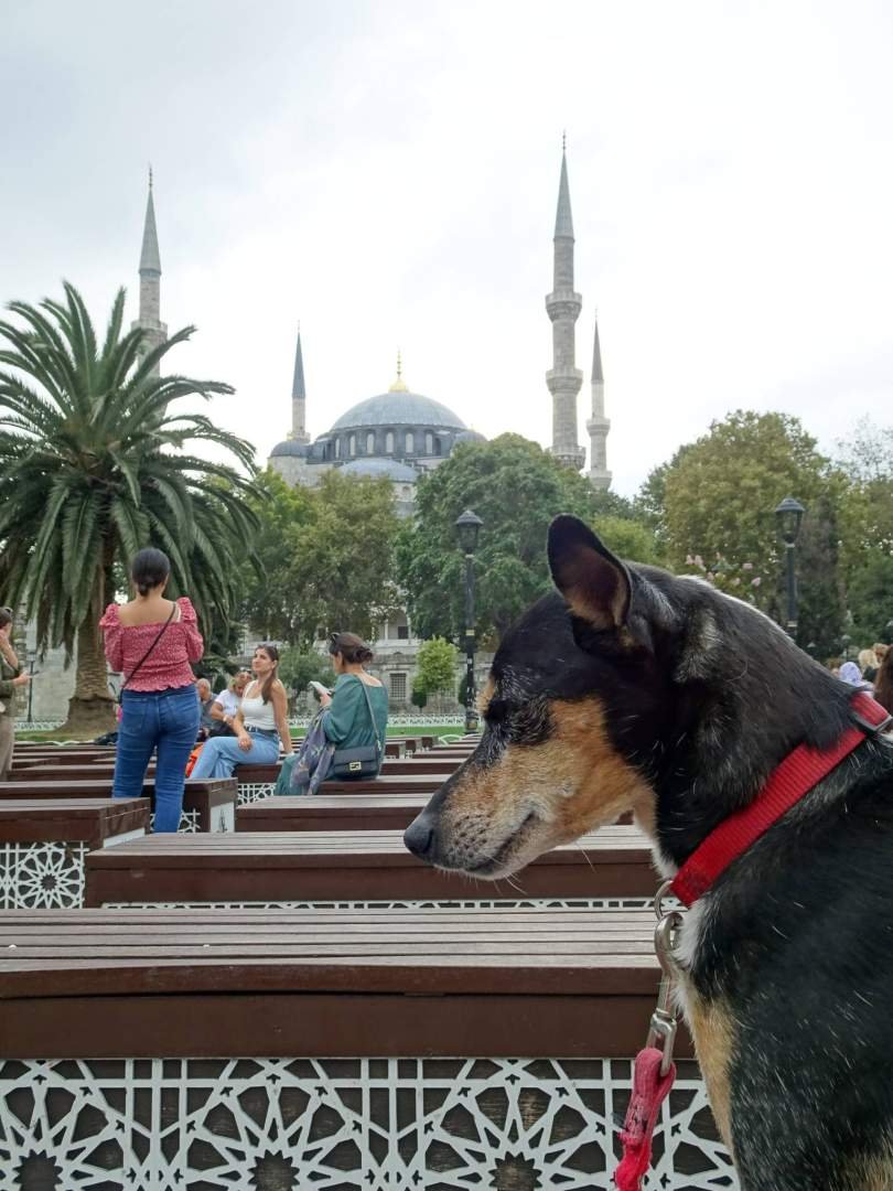 Aquí viene el momento en el que Tito Javi quería entrar en la Mezquita Azul, pero tuvo que esperar hasta las cinco, cuando termina la hora de rezar. Yo, por mi parte, no puedo entrar en templos, así que me quedé esperando en el jardín junto a la Mezquita Azul con mi papi Edu, disfrutando del aire fresco y de las miradas envidiosas de otros perros que pasaban.