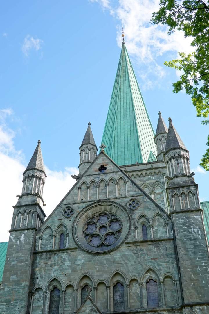 Y para terminar el paseo con estilo, visitamos la Catedral de Trondheim, también llamada Nidarosdomen, que es tan impresionante que hasta yo me quedé quieto mirándola un rato. La fachada parece una tarta de piedra gótica decorada con estatuas, ventanas y algún que otro cuervo de atrezo. Es el lugar donde coronan a los reyes de Noruega, aunque no vi ninguno ese día. Supongo que no se dejan ver si no llevas cita.