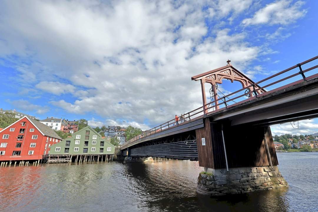 Entramos a la ciudad desde Bakklandet, que ya de por sí es un paseo. Casitas de colores, flores por todas partes, terrazas llenas de humanos con café y yo sin poder entrar a ninguna. Desde ahí cruzamos el Gamle Bybro, el Puente Viejo. Y qué puente, amigos. Rojo como mi pelota favorita y con unas torres de madera que parecen salidas de un cuento vikingo. Lo construyeron allá por 1861, pero ya había un puente en ese sitio desde el siglo XVII. Lo más guay es que cuando lo cruzas, parece que estás entrando en otro mundo... o saliendo de uno. Según el sentido, claro.