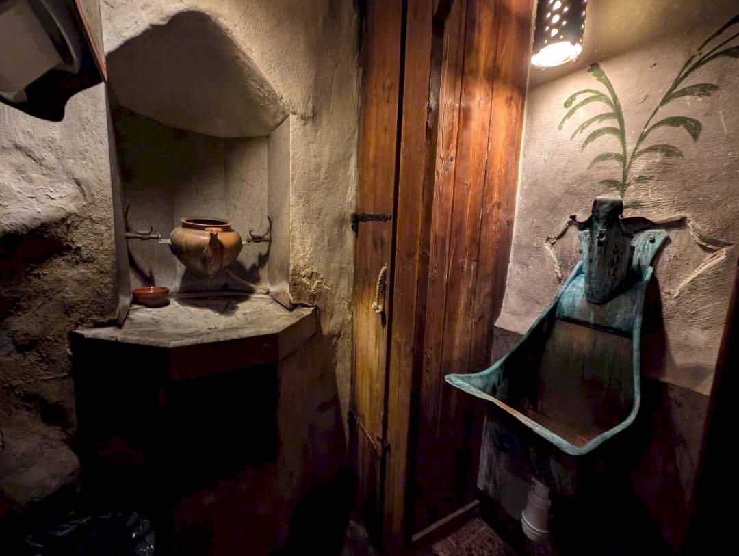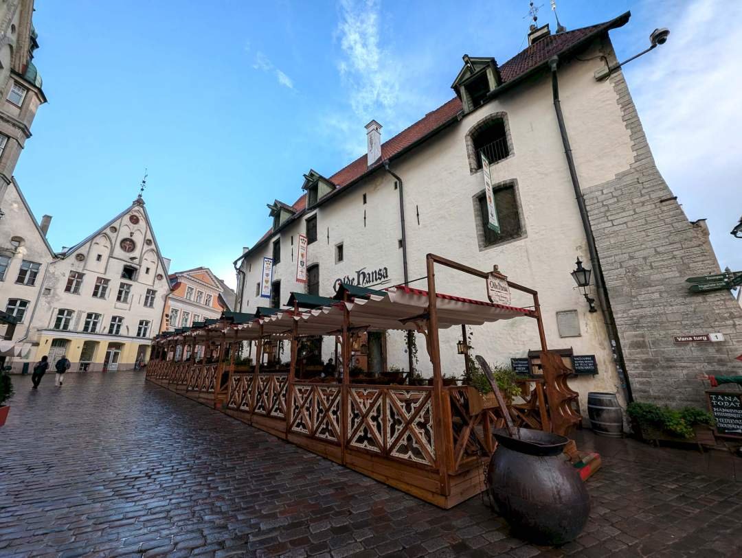 Buscamos refugio y nos metimos debajo de unas sombrillas medio torcidas frente a un restaurante muy curioso en plena plaza: Olde Hansa. Es todo estilo medieval, con velas, camareros vestidos de época y comida inspirada en recetas del siglo XV. Como el temporal era tan fuerte y yo puse mi mejor cara de perrito mojado, ¡nos invitaron a sentarnos dentro. Papi Edu y Tito Joan se tomaron un café o un chocolate, incluso a mí me pusieron un cuenquito con agua y nos quedamos un rato disfrutando del ambiente. El sitio sorprende mucho, porque parece que entraste en una película antigua. No hay nada moderno a la vista, ni Coca-Cola ni patatas fritas. Todo tiene ese punto turístico que te hace dudar... pero al final te metes en el rollo y lo disfrutas un montón.