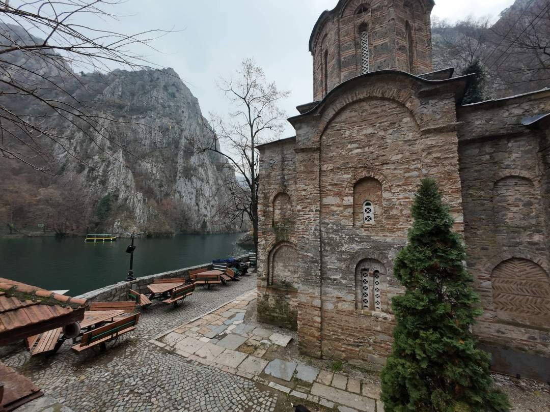 Cuando llegamos al cañón el panorama cambió. Allí hay de todo: una presa que forma un embalse, alquiler de barcos y kayaks, un hotel, una iglesia pequeñita... Vamos, un lugar que parece sacado de un catálogo de turismo de montaña. Pero nosotros, que ya hemos visto cañones y presas antes, decidimos no montar en barco. Además me pareció que sería como el cañón de Albania que visitamos hace un par de años, ¿os acordáis?