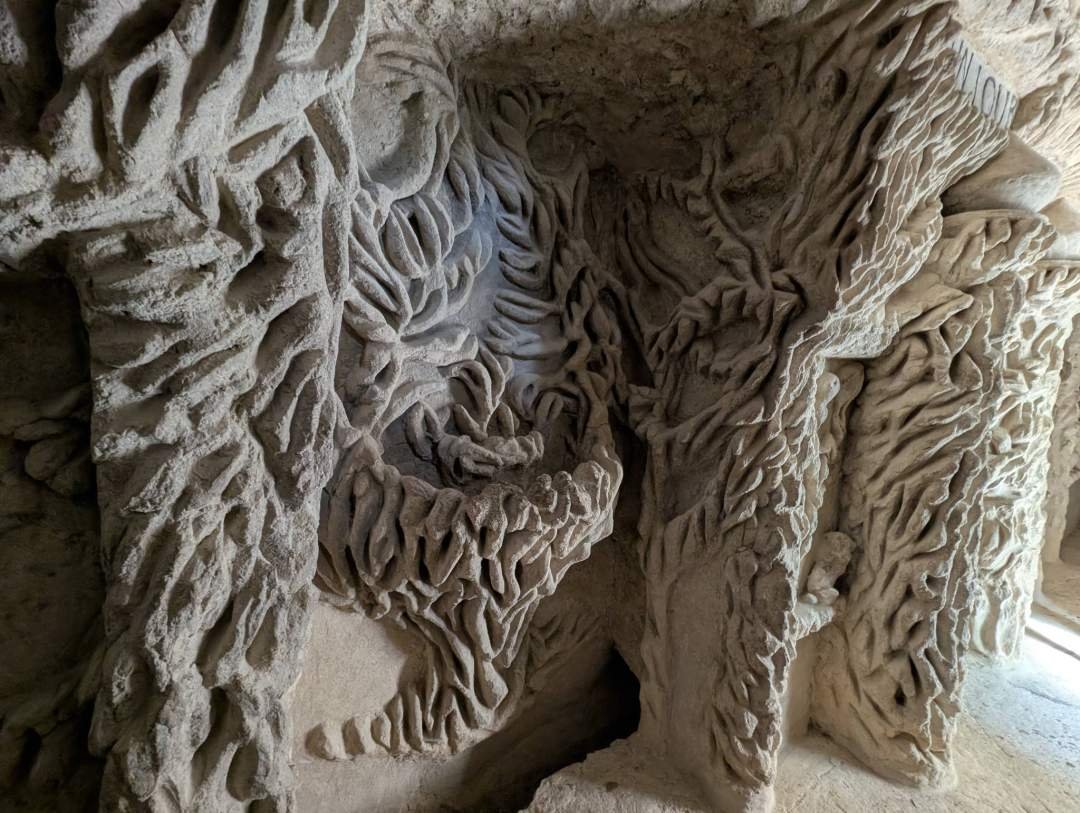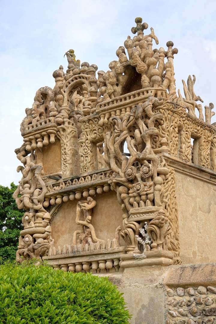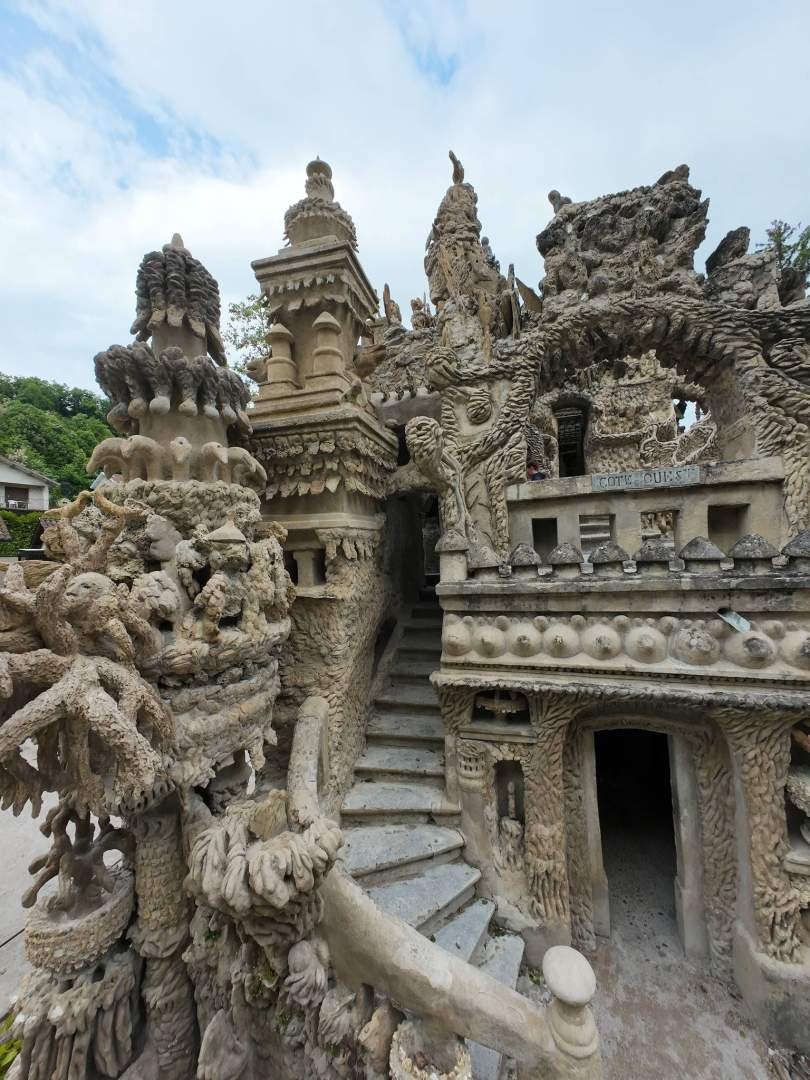 Se dice que la inspiración le vino de todas las postales que pasaban por sus manos, como si cada timbre le susurrara una torre, cada matasellos una gruta. El resultado es una mezcla de catedral, castillo de arena y parque temático de civilizaciones. Hay columnas hindúes, torres árabes, grutas egipcias, escaleras imposibles, y más detalles de los que mi nariz podría olfatear en una semana. Algunos lo comparan con las obras de Gaudí, pero mientras Gaudí tenía arquitectos, artesanos, mecenas y planos, Cheval lo hizo todo él solo, con su carretilla y un cabezón del tamaño de una cúpula. Lo suyo es el surrealismo rural a base de cal y sudor.