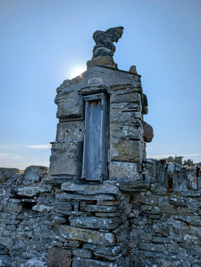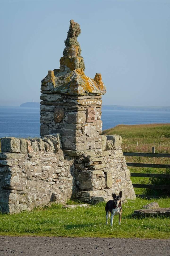 Después seguimos hacia el norte, y como ya era hora de comer, paramos en un aparcamiento costero junto al Nybster Broch. Este sitio es una joyita. Arriba del acantilado está el broch, que es una especie de torre prehistórica circular construida con piedras sin cemento ni nada. Se cree que los construyeron hace más de dos mil años, y nadie sabe del todo para qué: ¿defensa? ¿vivienda? ¿club secreto celta? Y repartidos por el campo hay pequeños monumentos, obra de John Nicolson, del siglo XIX. Son esculturas talladas que recuerdan a una pequeño templo rústico en mitad del campo. Muy curioso y muy “Escocia con eco antiguo”.