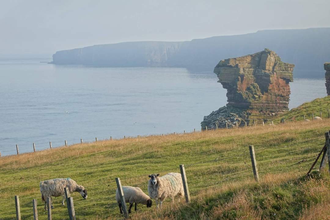 Con la barriga llena, seguimos por la costa y llegamos a John o’Groats, uno de esos lugares que suena a fin del mundo, y un poco lo es. Pero no paramos allí, sino que fuimos directamente a Duncansby Head, el verdadero punto más noreste de la isla de Gran Bretaña. Allí hay un faro blanco, pastos llenos de ovejas sospechosamente tranquilas, y un sendero por los acantilados que lleva a los Duncansby Stacks, unas agujas de roca que parecen dientes gigantes saliendo del mar. Impresionan incluso cuando, como hoy, una niebla se coló por la costa y lo envolvió todo en un aire de cuento misterioso. Parecía que íbamos a ver aparecer un dragón o, como mínimo, un gaitero fantasma.