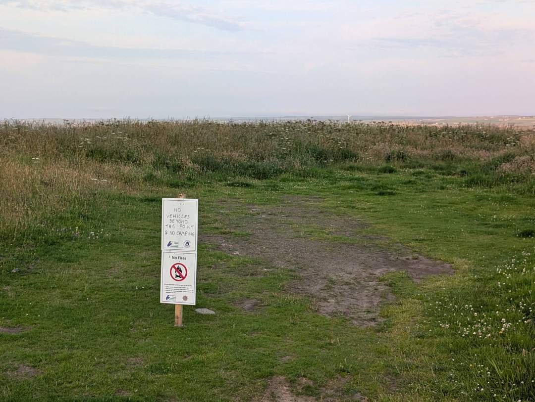 Y entonces llegó la parte difícil: buscar sitio para dormir. En John o’Groats todo está prohibido. Vale, no lo decían con gritos, pero los carteles dejaron claro que allí no somos bienvenidos. Decidimos ir hacia Dunnet Head, una zona natural teóricamente abierta a la pernocta, pero todos los caminos estaban bloqueados con piedras, cadenas, ruedas de tractor, y carteles hostiles. Encima, en Park4Night se habla de vecinos cabreadísimos que tiran huevos, bloquean salidas y lanzan miradas que te bajan la suspensión de la camper.
