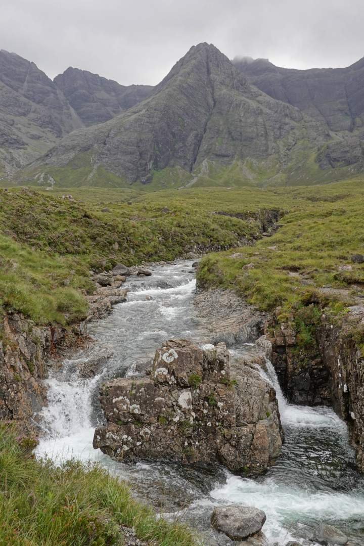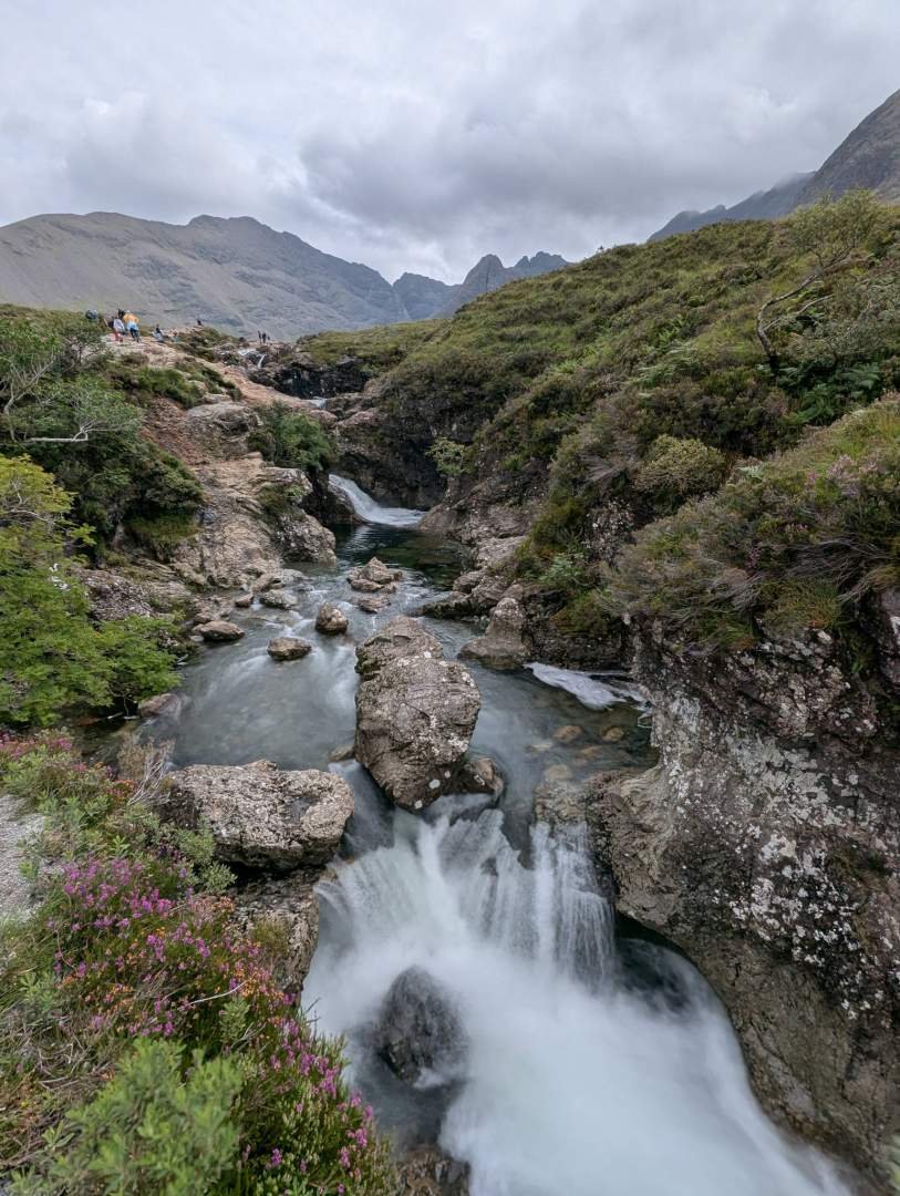 A las doce y media, sin mover el coche ni gastar una sola libra, caminamos desde nuestro aparcamiento hasta las famosas Fairy Pools. Diez minutos de paseo y llegamos. Las Fairy Pools son una serie de cascadas cristalinas y pozas naturales que bajan desde las montañas de Cuillin. Dicen que si te bañas allí, una hada escocesa te concede un deseo. Yo pedí croquetas de pato, ya veremos si funciona. Eso sí, ¡madre mía cuánta gente! Parecía que todas las hadas habían invitado a sus amigos y familiares. Subimos hasta lo que parecía el final del recorrido, hicimos fotos, selfies, y cuando ya estábamos saturados de turismo… ¡al coche volando!
