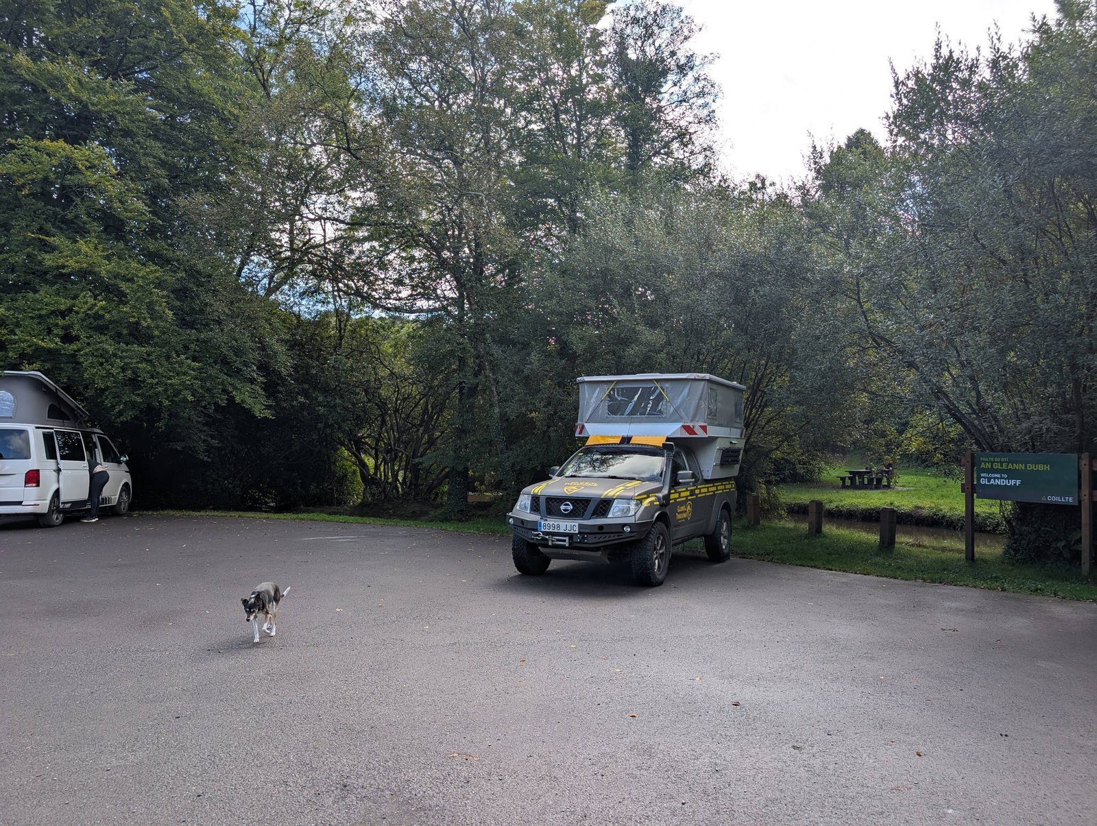 Despertamos al pie del castillo Castledonovan, con la torre vigilando nuestro sueño como un guardián de piedra. El sitio era tan tranquilo que parecía inventado para nosotros. Papi Edu, encantado, lo puso en Park4Night para que otros viajeros puedan descubrir este rincón mágico. Yo olisqueé las hierbas húmedas, marqué un par de arbustos (cuestión de protocolo) y sentí que comenzábamos el día como auténticos nobles caninos.