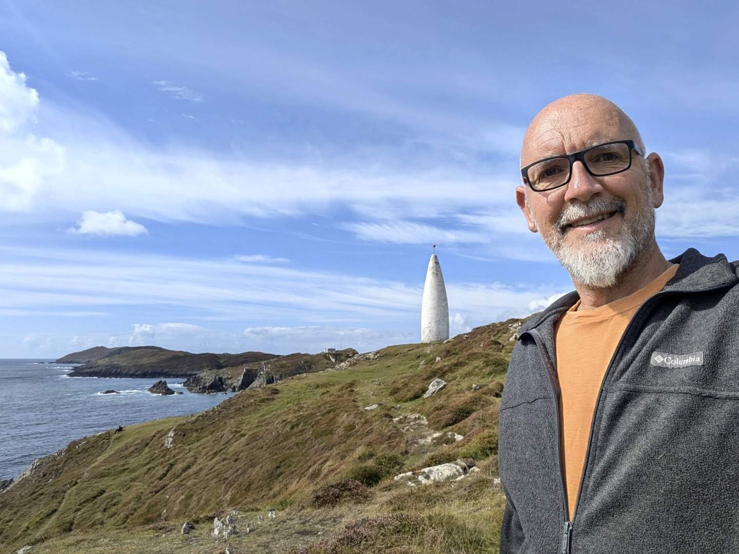 Salimos sobre las doce y nos lanzamos a la carretera. Tres cuartos de hora después llegamos a Baltimore Beacon, o como lo llaman en español, la Baliza de Baltimore. Aparcamos y caminamos hasta la cima. El sendero era precioso, con el mar desplegándose en mil tonos de azul y las colinas verdes detrás. El beacon, un obelisco blanco que parece un cono de helado gigante plantado en lo alto, fue construido en el siglo diecinueve como señal para los barcos. Desde allí arriba uno se siente como dueño del horizonte; yo me imaginé ladrando órdenes a todos los barcos del Atlántico.