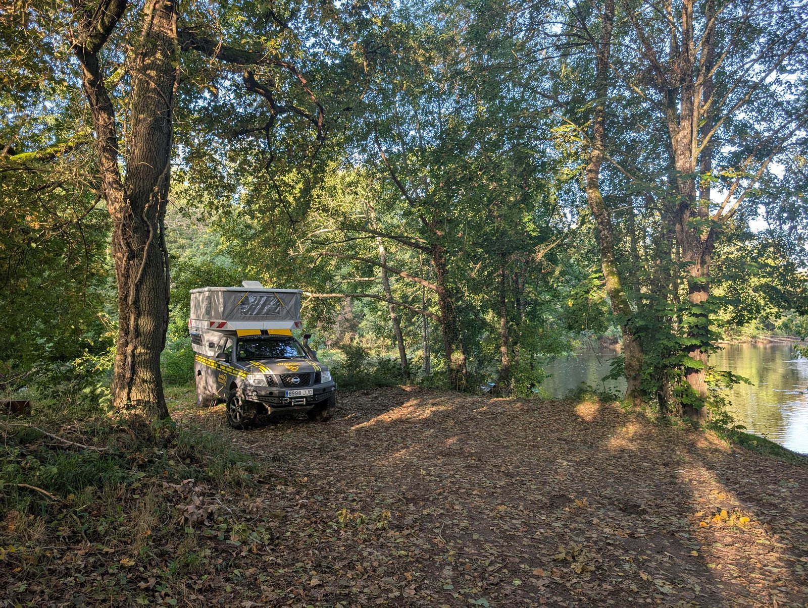 Así que, ya cerca de las siete, arrancamos y condujimos media horita más hasta un sitio como los que nos hacen dar volteretas de felicidad interior: cerca de Chitray, junto al río Creuse, escondidos entre árboles, sin vecinos, sin farolas, sin normas colgando de señales. Solo agua tranquila, silencio y nuestro hogar sobre ruedas. Aquí sí, aquí nos quedamos a dormir. Entre raíces, reflejos y aire que huele a musgo y libertad.