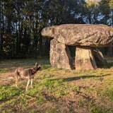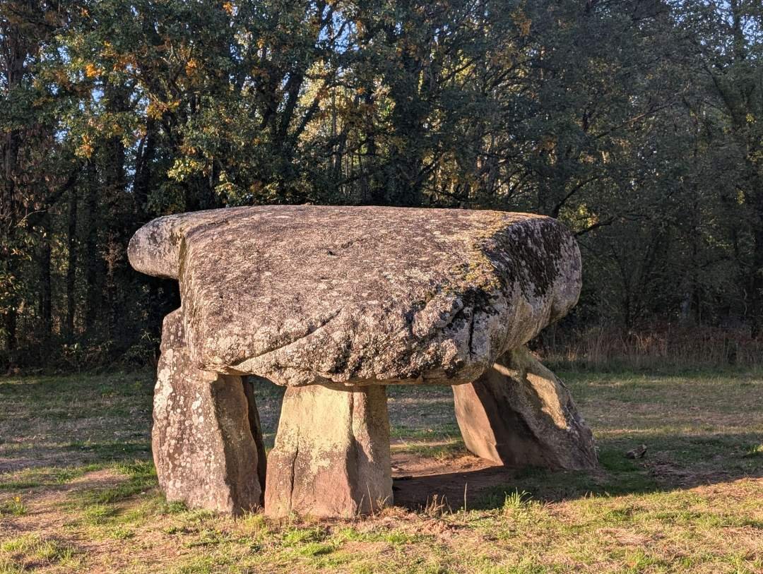 Más tarde, con energías renovadas y sin rumbo claro, papi se puso en modo “vamos viendo”. La idea general era acercarse al Parque Natural Regional Périgord-Limousin, pero sin estrés. De camino exploramos varios posibles lugares para dormir: uno en el bosque, cerca de Cognac-la-Forêt, muy tranquilo pero con menos encanto que una caja vacía; otro junto a un dolmen, un pedrusco prehistórico tan digno como los que vimos en Irlanda, pero aquí gratis y sin turistas. El problema: estaba pegado a la carretera. Dormir al ritmo de los camiones no sonaba tentador.