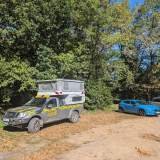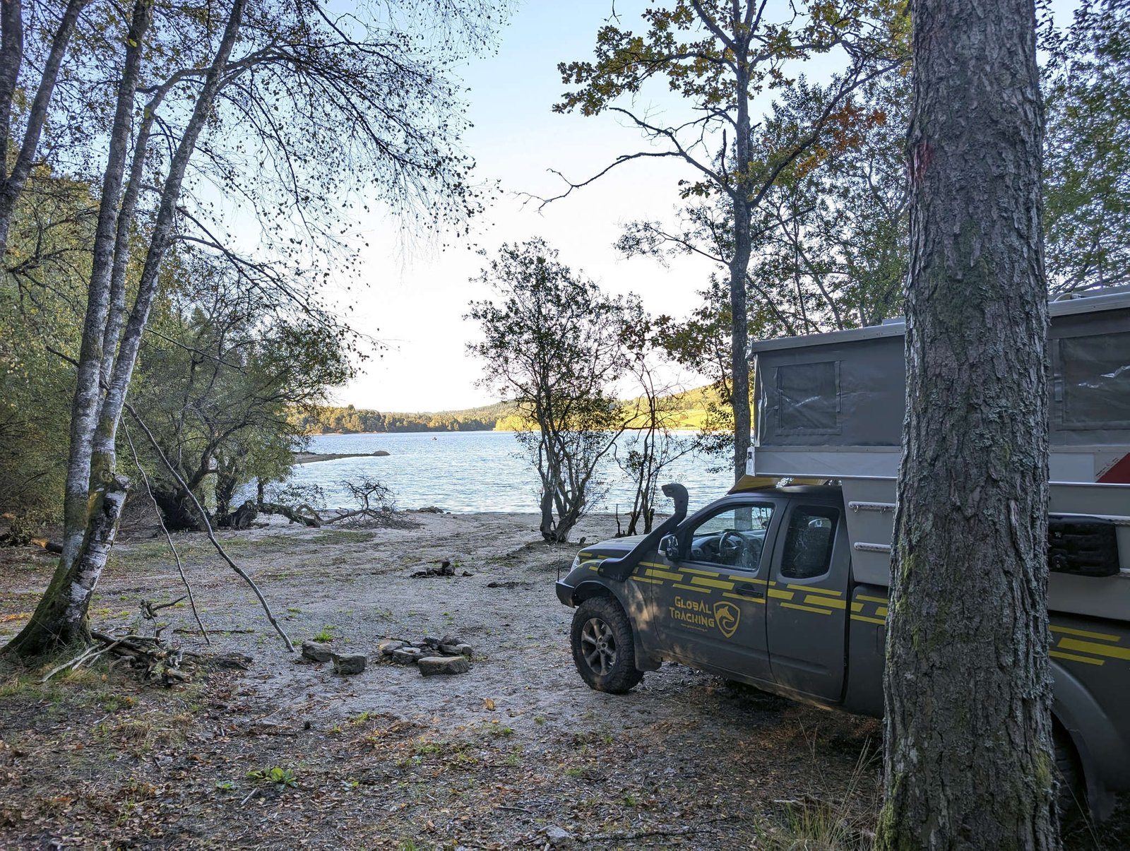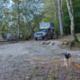 Este sitio es de los mejores de Francia, lo digo yo que he olido medio país. Aparcamos entre los árboles, casi todos pinos, y solo hay un roble… pero este es decente y no tira bellotas asesinas como los de ayer. Aquí se respira paz, aventura y un poco de barro delicioso. La luna se asoma, el lago se estira, y yo ya tengo decidido que esta noche soñaré que soy el guardián oficial de la playa secreta.