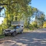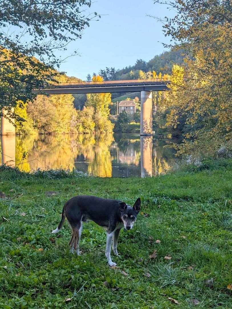 Después del descanso, arrancamos y nos hicimos unos treinta kilómetros hasta Conques-en-Rouergue. Pero no entramos al pueblo, porque papi había fichado en Park4Night una pradera secreta junto al río Lot. Y ahí sí que dije: ¡guau, guau y requeteguau!