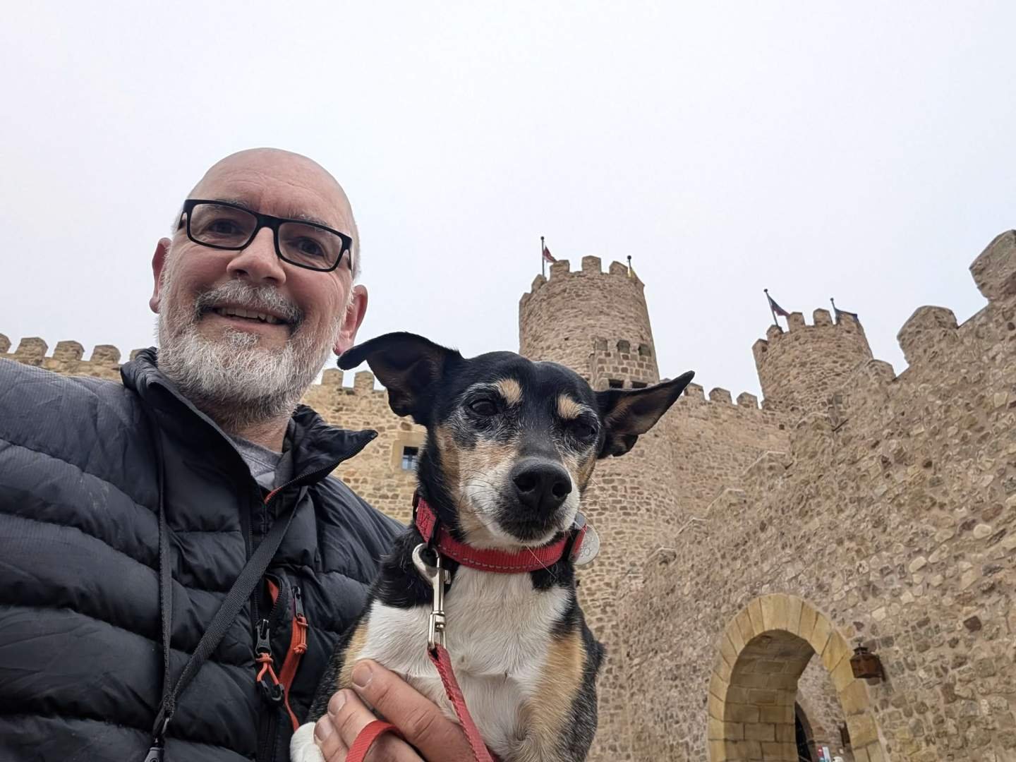 Arrancamos con calma y pasado el mediodía pusimos rumbo a Sigüenza. Aparcamos cerca del centro y nos lanzamos a explorar a pata, que es como mejor se entienden los pueblos. Empezamos por la Alameda, un parque largo y agradable, con árboles altos y ese aire de paseo de domingo aunque no fuera domingo. Desde allí llegamos al monasterio de las Hermanas Clarisas, un edificio sobrio por fuera, muy de recogimiento. Justo delante hay algo que siempre deja a los humanos con cara rara: un esqueleto humano auténtico bajo un cristal, colocado allí como recordatorio de lo poco que dura todo. Yo lo olí con respeto y seguí caminando, que ya tengo bastante con mis propias reflexiones perrunas.