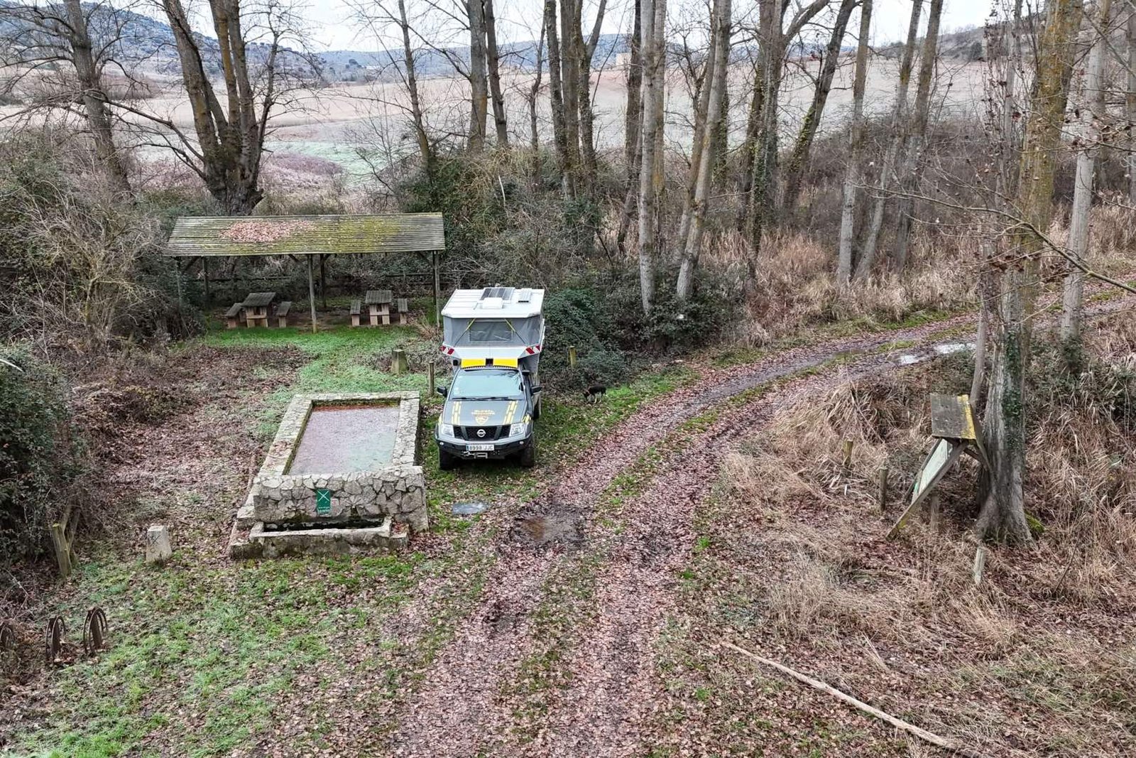 Dormimos de lujo. Fuera hacía un frío serio, de esos que te hacen pensar si no tendrás escarcha también en los pensamientos, unos cuantos grados bajo cero. Dentro de la cámper, en cambio, con la calefacción, estábamos tan a gusto que ni fantasmas ni zombis se atrevieron a venir a molestar. Yo dormí como un tronco feliz. Por la mañana, con luz, el sitio que de noche parecía sacado de una peli de miedo resultó ser bastante normal. Hasta simpático. La fuente tenía el agua completamente congelada, detalle que siempre suma puntos al drama invernal.