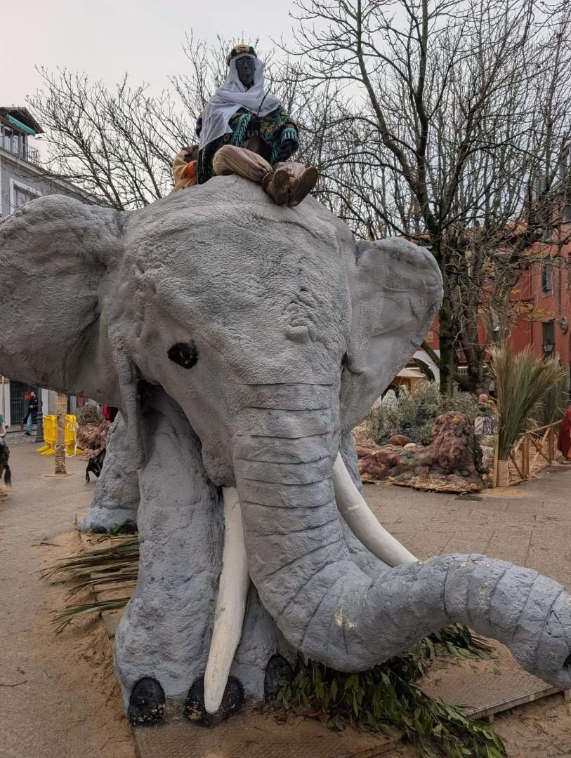 Volvió a la cámper, me sacó y juntos dimos un paseo por los alrededores del monasterio, que tienen zonas verdes muy agradables. Luego entramos en el pueblo, San Lorenzo de El Escorial, que estaba llenísimo de gente. Era curioso porque por las calles y plazas había muchísimas figuras como de belén, de tamaño casi humano, hechas en plan papel maché, montando un nacimiento gigante entre tiendas, bares y turistas. Yo iba esquivando pastores, ovejas falsas y algún rey mago sospechoso.