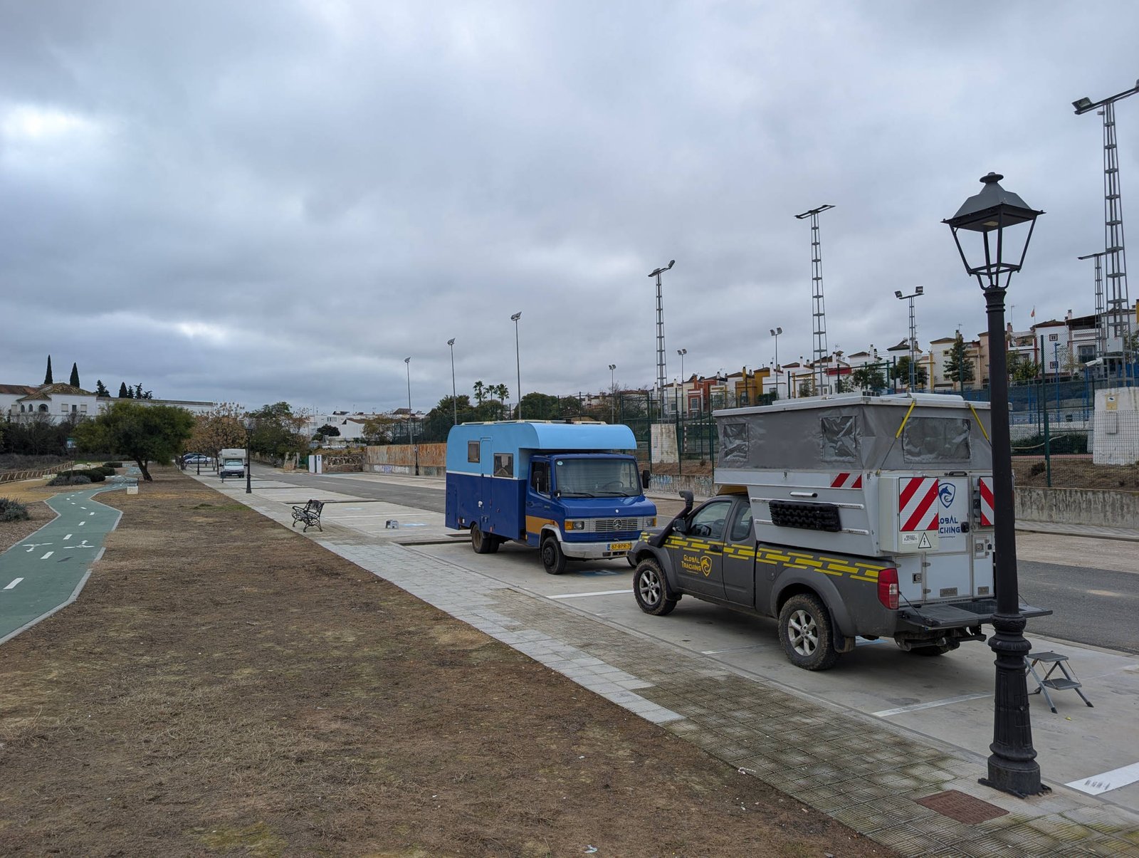 Llegamos casi de noche al área de autocaravanas de Castilleja de Guzmán. No es un área con servicios, solo un buen sitio para aparcar y dormir, pero tiene unas vistas estupendas a Sevilla. Desde aquí se ve la Torre Pelli, ese rascacielos moderno que destaca en el horizonte, y si afinas bien la vista, la Giralda aparece pequeñita, como si alguien la hubiera puesto allí con cuidado. En el aparcamiento ya hay unas quince o veinte cámpers y autocaravanas. Nosotros quedamos aparcados entre una holandesa y una finlandesa, bien acompañados y bien resguardados.