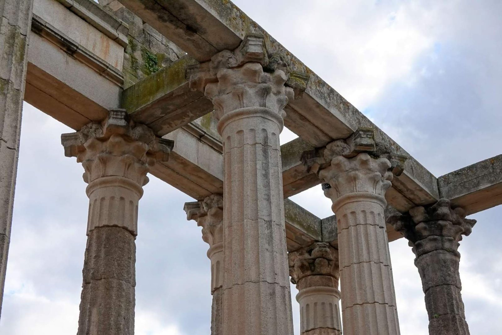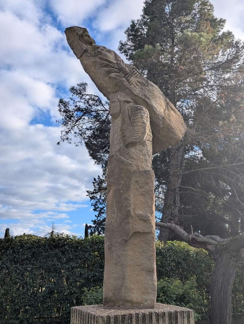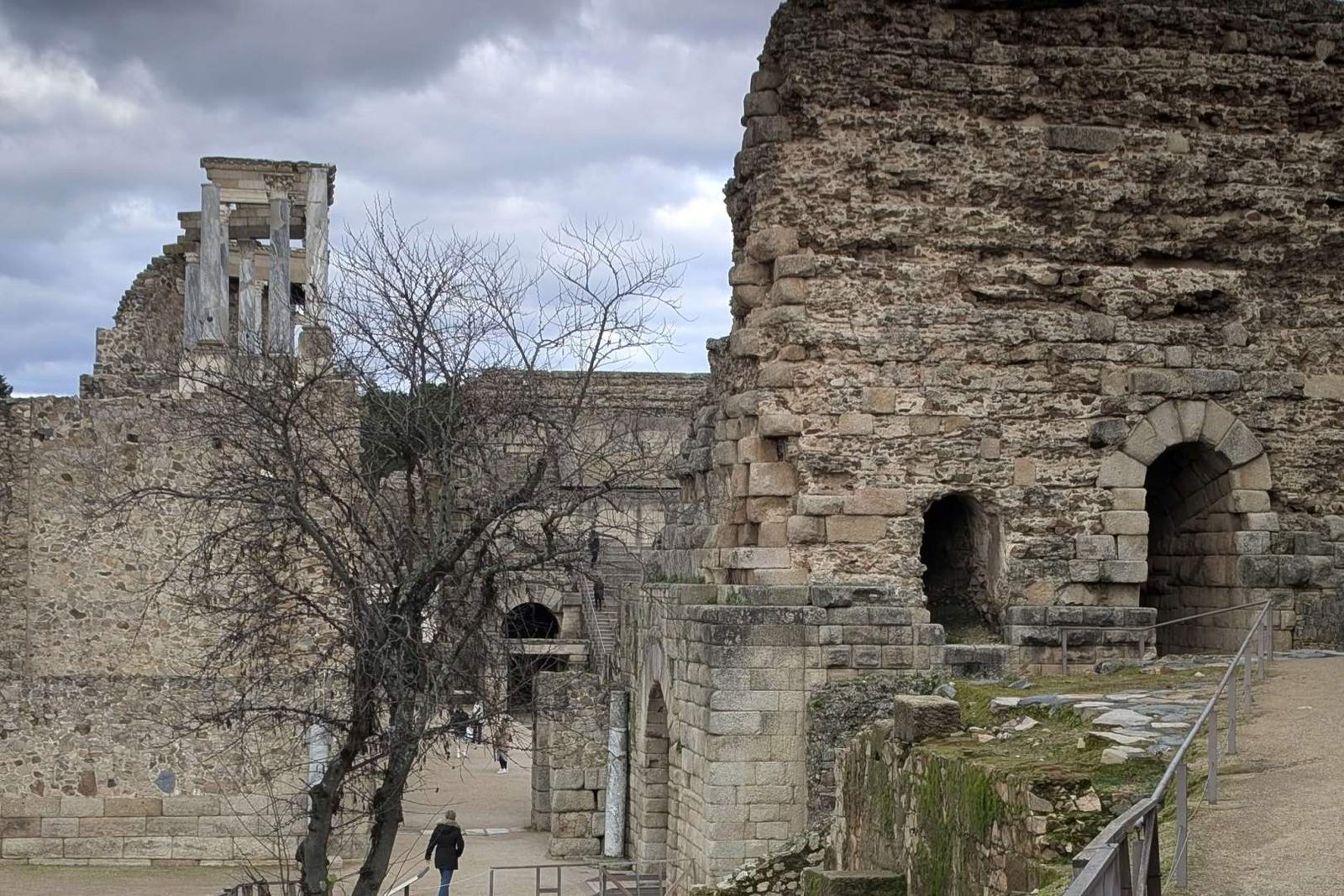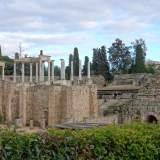 De ahí fuimos hacia los teatros romanos con mucha ilusión… y mala suerte. No entramos y desde fuera no se veía casi nada. Chasco colectivo, asumido con dignidad viajera. Bajamos entonces al Templo de Diana, en pleno centro y rodeado de edificios. Muy guay. Columnas enormes, bien conservadas, imponiendo respeto en medio del jaleo urbano. Papi Edu y tito Joan entraron por turnos porque yo no podía pasar. Una señora muy habladora se ofreció a hacernos una foto y acabó contándonos medio Mérida. Guía espontánea, simpática y con verbo para rato.