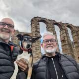 Seguimos caminando hasta el Acueducto de los Milagros. Y sí, es un señor acueducto. Alto, elegante, lleno de arcos que parecen no acabar nunca. Nos quedamos un buen rato mirándolo, que es imposible no quedarse embobado, incluso para un perro con prisa por oler cosas nuevas.