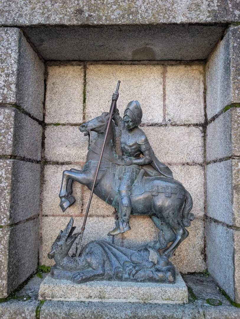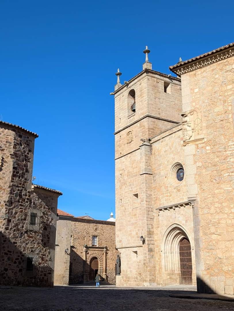 Pasamos también por el Convento de San Pablo, silencioso como un gato al acecho, y llegamos a la plaza de San Jorge, donde está la estatua del santo cargándose al dragón. Yo miré al dragón con respeto profesional. Luego la Concatedral de Santa María de Cáceres, sobria por fuera y poderosa por historia.