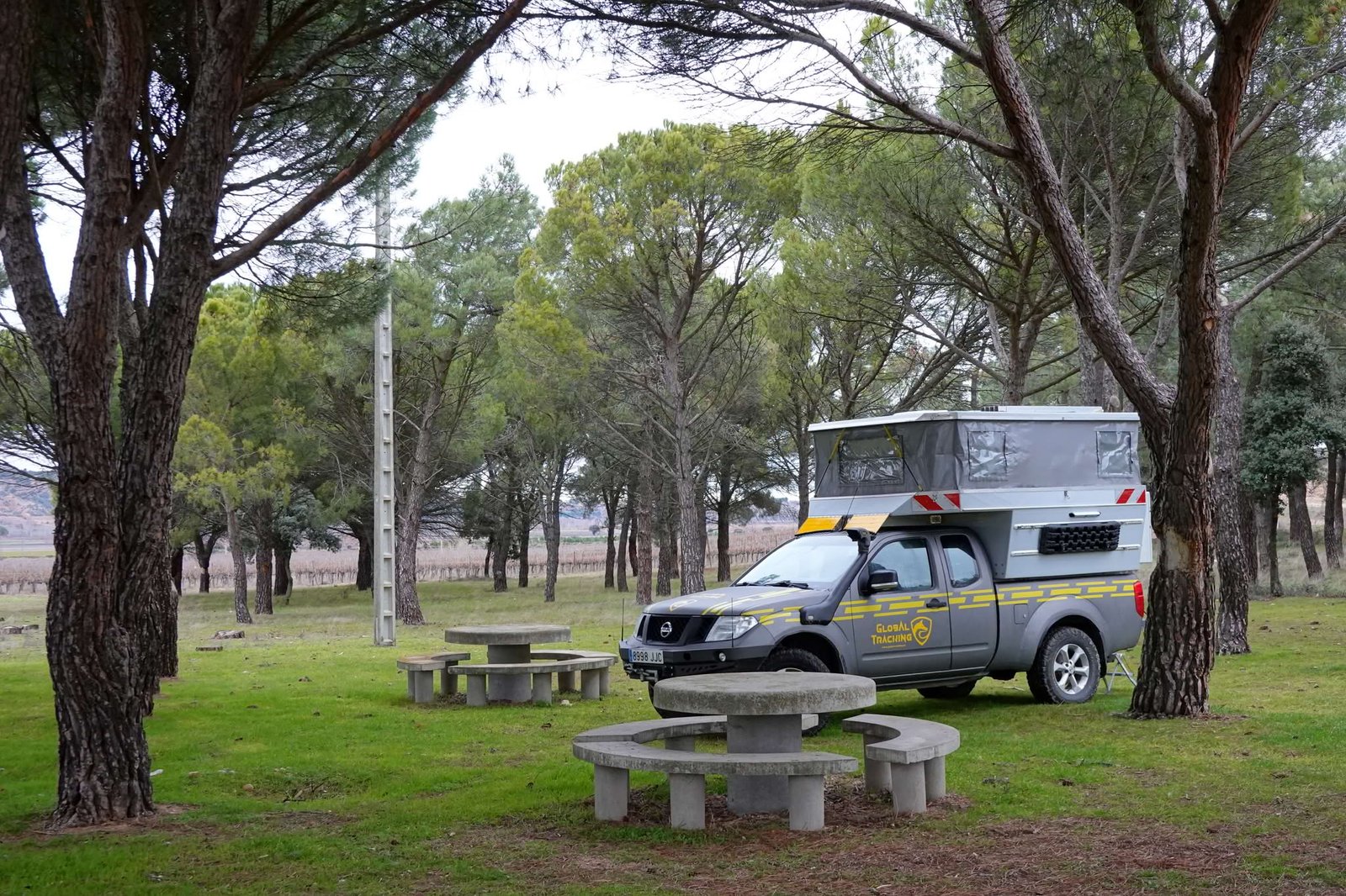 Sobre las seis llegamos a un área de picnic bajo los pinos, en Nava de Roa. Un sitio muy tranquilo, bonito, rodeado de árboles y silencio. Aquí nos vamos a quedar a dormir. Calefacción encendida, cena sencilla, película de fondo y yo ya enroscado en mi canasta, escribiendo esto con un ojo abierto y otro medio cerrado. Rutina de noche perfecta.