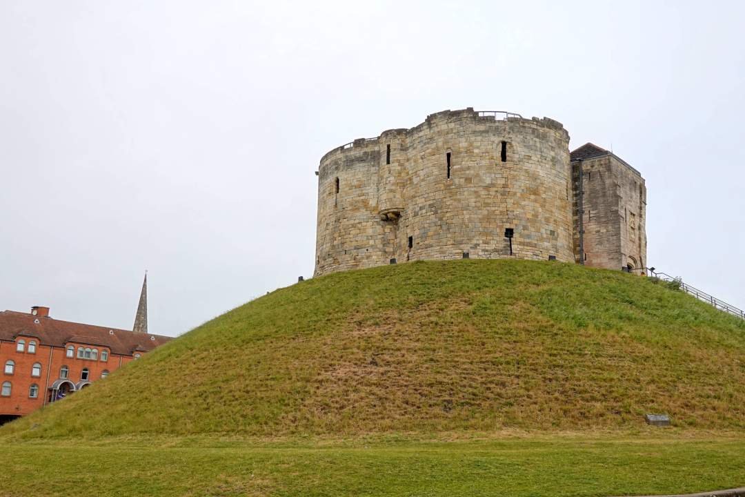 We bleven langs de rivier lopen, staken het Rowntree Park over (waar ik per ongeluk bijna een vliegende frisbee opat) en bereikten het centrum. Daar zagen we, van buitenaf, de Clifford's Tower, een oude toren op een zeer ronde heuvel. Ze zeggen dat hij Normandisch is. Ik zag geen Normandiërs, alleen toeristen die hijgden bij het beklimmen. We gingen niet naar boven. Met mijn korte pootjes leek die heuvel verdacht veel op de Himalaya.