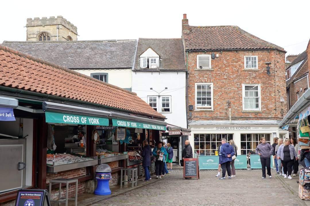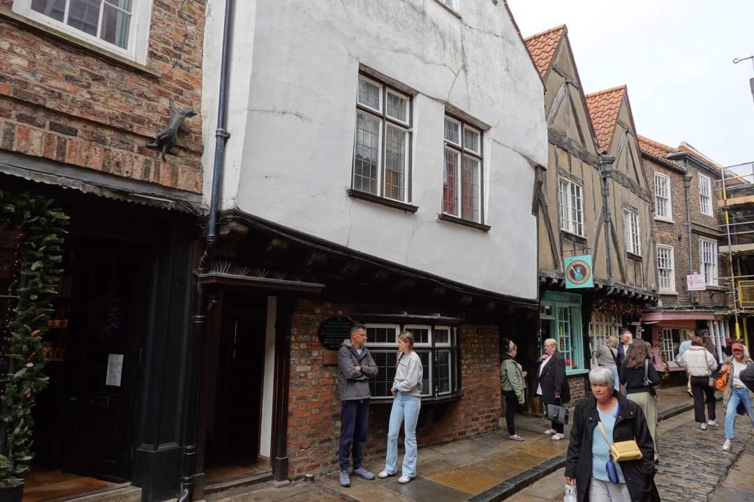 Daarna gingen we The Shambles in, een straat die eruitziet als een filmdecor uit de middeleeuwen... omdat dat in feite zo is. Er zijn scheve huizen, oude uithangborden, winkels met heksen en toverstokken, en een menigte toeristen die vechten om selfies te maken alsof ze zullen verdwijnen als ze het niet doen. Ze zeggen dat het Harry Potter heeft geïnspireerd. Mij inspireerde het om weg te rennen. Te veel mensen, te veel winkels, te veel dingen die je niet kunt eten.