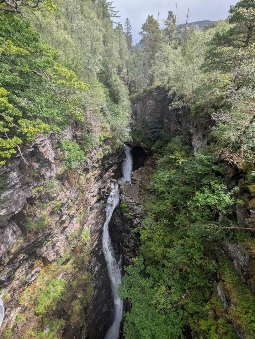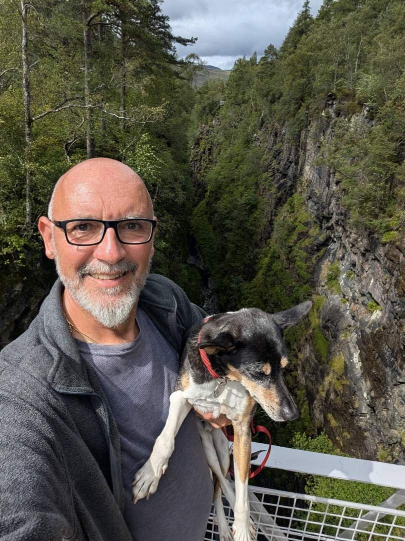 Avontuur? Zeg je avontuur? Nou, vandaag was het meest avontuurlijke wel de hangbrug oversteken met de haren in mijn nek omhoog. Maar laten we het even stap voor stap bekijken. We werden wakker met regen op de parkeerplaats bij de ingang van Ullapool, en omdat niemand haast heeft in een wolk, vertrokken we pas rond het middaguur. Een half uurtje later (oke, twintig minuten, maar ik was in slaap en alles lijkt me lang) kwamen we aan bij Corrieshalloch Gorge. Er is een bezoekerscentrum met een betaalde parkeerplaats, maar papa Edu, die niet achterlijk is, parkeerde op een parkeerstrook vijftig meter verderop. Gratis. De parkeerplaats zou er zijn voor het onderhoud van het park. Maar even serieus: vijf pond per persoon, ook al ben je maar één hoofd? En als er vijf mensen in één blik met wielen zitten, allemaal voor één pond? Leg mij dat maar eens uit. Het zou beter zijn om te zeggen "dit kost vijf pond per persoon" en klaar. Maar nee, ze camoufleren het. Net als de hondenbrokken die ze proberen te camoufleren met bouillon... ze houden mij niet voor de gek. De plek is mooi, ja. De kloof maakt indruk, er is een hangbrug (maar niet veel, want hij is best stevig) en een platform dat over de afgrond hangt voor degenen die zich valken voelen. Papa poseerde daar alsof hij geen hoogtevrees had, maar ik zag hoe zijn pootjes trilden. We deden de lange route, wat hetzelfde is als zeggen: "we liepen het hele park rond". Alleen is het park mini en de route is ongeveer drie kilometer lang. Bovendien is het zo goed geplaveid dat je er met een step overheen zou kunnen. Er was geen modder. Geen avontuur. Zelfs geen rebelse eekhoorn. Ik zou het meer een "scenische excursie met een leuning" noemen, dan een wandeling. Daarna gingen we terug naar de auto en reden we ongeveer veertig kilometer naar een uitkijkpunt over Gruinard Beach. Het gebruikelijke: parkeerstrook, ansichtkaartlandschappen en decoratieve schapen. Maar papa Edu heeft goede ogen en betere wielen, dus hij vond een stukje veld boven het uitkijkpunt waar je alleen met een auto met een berggeitgeest kunt komen. Onze camper reed zonder problemen en met waardigheid naar boven, en van daar... wauw, wat een uitzicht! Het vervelende is dat er ook midges zijn. Hele horden. Wolken van steekbeesten met poten en vleugels. Dus ja, we hebben het beste uitzicht van heel Schotland, maar we kunnen het alleen door de ramen zien. We aten binnen. We zagen de zonsondergang van binnen. We besloten hier te slapen. Binnen. En we zijn heel blij. Echt waar. Hoewel ik al vermoed dat papa Edu op deze manier Gaelic gaat leren zonder ook maar één modderig pad in heel Schotland te betreden.