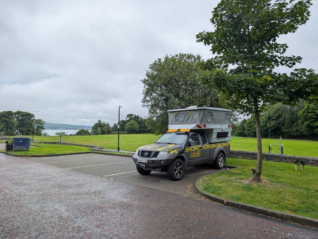 We vertrokken rond half twaalf en na een stukje rijden kwamen we aan bij het bezoekerscentrum van iets wat heel spannend klonk: de Gobbins Cliff Path. Dat is een pad dat aan de kliffen hangt, met loopbruggen en tunnels die aan de zee vastzitten. Kortom, een perfecte plek om de wind in je oren te voelen en de zilte zeelucht flink op te snuiven. Maaaar… de dame bij de ingang, heel aardig hoor, vertelde ons dat er vandaag geen plek was. Gelukkig stuurde ze ons niet met de staart tussen de benen terug, maar adviseerde ze ons om naar Whitehead te gaan, op slechts tien minuten rijden, waar een pad naar de vuurtoren van Blackhead liep.