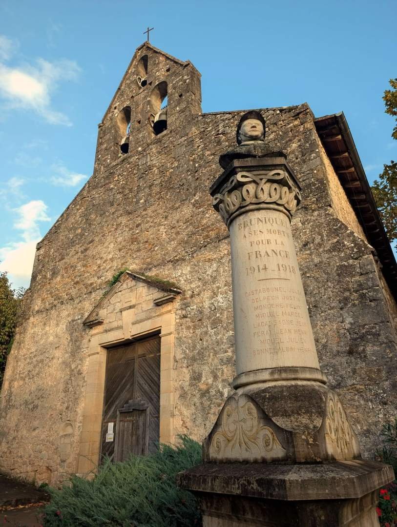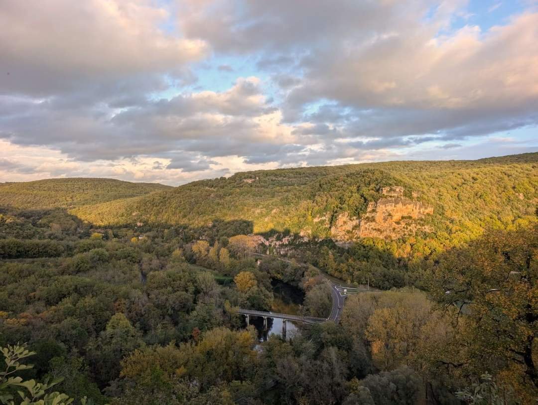 's Middags, alsof iemand daarboven op de "prettige modus" -knop had gedrukt, gingen de wolken open en kwam de zon tussen de bomen door. We gingen Bruniquel verkennen, een klein en verrassend charmant dorp. Geplaveide straten, huizen van gouden steen en balkons die elkaar bijna raken boven de straatjes. Boven domineren de twee forten het landschap, de een naast de ander, als oudere zussen die weigeren met pensioen te gaan. Vanaf daar zie je de rivier de Aveyron kronkelen op de bodem van de vallei, rustig en wijs.