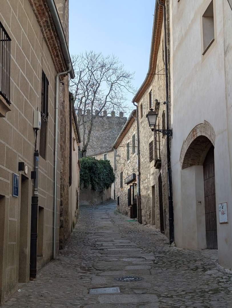 We voelden ons heel goed op de plek. Echt rustig. Geen verkeer, geen stemmen, geen haast. Dus vertrokken we nog langzamer dan normaal. Ontbijt zonder klok, een korte wandeling in de omgeving en ik controleerde of alles nog op zijn plek stond, wat nooit kwaad kan. Voordat we met de auto vertrokken, maakten we een korte wandeling over de Romaanse brug. De brug kruist de rivier de Almonte en dateert uit de zeventiende eeuw. Van stevig steen, met elegante bogen en die serieuze uitstraling van iemand die veel heeft zien gebeuren en het niet hoeft te vertellen. Ik vond het mooi. Heel erg.