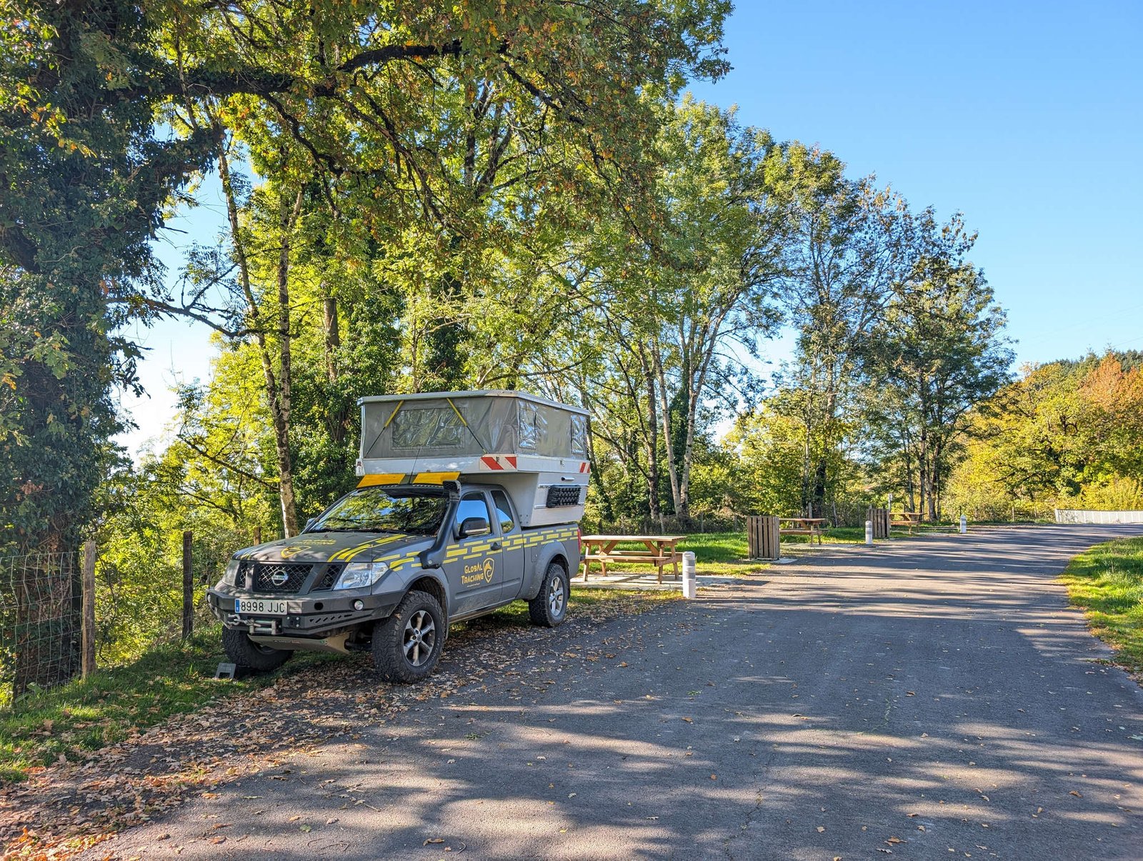 A las siete ya el sol había chapado persianas y regresamos al coche. Toca buscar cama. Entre desvíos tontos cortesía de Google Maps y alguna rotonda que no llevaba a ningún sitio, acabamos en un área de descanso junto a la N122. Hay un terraplén que separa la zona de picnic de la carretera, así que no da sensación de camiones metiéndose en la almohada. Si miras hacia un lado, ves coches pasar; si miras al otro, parece hasta bucólico. Yo huelo hierba, aire fresco y algo de cena, así que para mí es cinco estrellas.
