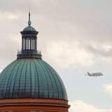Seguimos hasta el Pont Neuf, que de “nuevo” tiene lo justo, y lo cruzamos para pasear por el parque Prairie des Filtres, un trocito verde junto al Garona donde huele a tierra húmeda y pan recién hecho. Por el Pont Saint-Michel volvimos a cruzar el río, caminando por el paseo que lo bordea. Allí, mientras papi señalaba algo en el cielo, apareció un bicho volador descomunal: un Airbus Beluga XL, el avión más curioso del mundo. Parece una ballena con alas y cara de que siempre está a punto de sonreír. Toulouse es su casa, claro: aquí está la fábrica de Airbus, donde montan aviones gigantes con precisión de reloj suizo y tamaño de edificio.