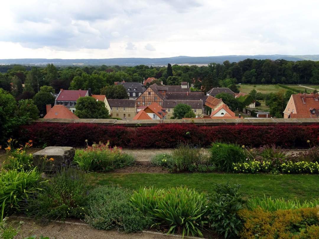 Mi papi dijo que el pueblo ❶ donde hemos dormido al lado es el l principal conjunto de casas de vigas entramadas de Alemania, así que lo hemos echado un vistazo. No es muy grande, pero sí es súper bonito. Efectivamente la mayoría de las casas en el casco antiguo son de estas típicas casas alemanas y esto da mucha alegría. No eramos precisamente los únicos que estaban visitando el pueblo. ¡Madre mía, cuántos turistas! Pero sigue siendo un lugar donde realmente vive gente. Paseamos un par de horas por el centro; sobre todo la plaza del mercado ❷ con el ayuntamiento es muy bonita. También visitamos un parque y los jardines de un monasterio. En el medio del pueblo hay una colina con una iglesia encima. La iglesia estaba en obras pero desde el pequeño parque hay unas vistas muy chulas.