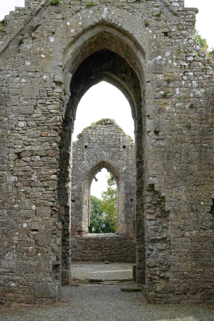 Era Moor Abbey, una antigua abadía franciscana del siglo XIII. No hay entradas ni taquillas, solo piedras desnudas, muros que se abren al cielo y un silencio que parece rezar por sí solo. Aparcamos al lado y nos metimos dentro. Yo corrí por el césped, olisqueé columnas y ventanas sin cristales, y pensé: “estos humanos de antes sí que sabían hacer escondites de lujo”.