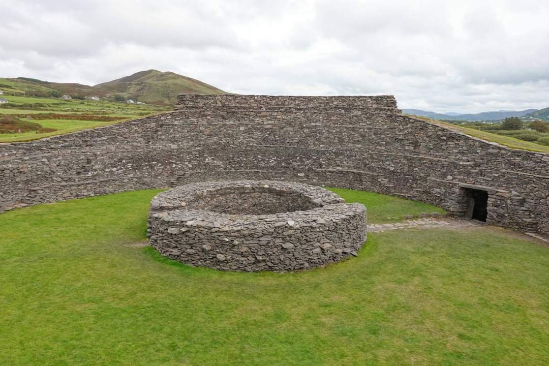 And what a test: almost an hour and a half on roads with many curves and quite narrow at first, although later they became wider and better. I was glued to the window, watching every bush that threatened to get inside. In the end we arrived at two round stone forts like giant donuts: Cahergall and Leacanabuaile. Dad parked and we went into Cahergall. That was cool. A huge circle of very high walls, like a bullring for giants. I started to go around inside as if I were in a Roman coliseum and the invisible audience was cheering me on. It was so well preserved that I even thought: "Surely the humans have done some botched restoration here, because otherwise, what a miracle".