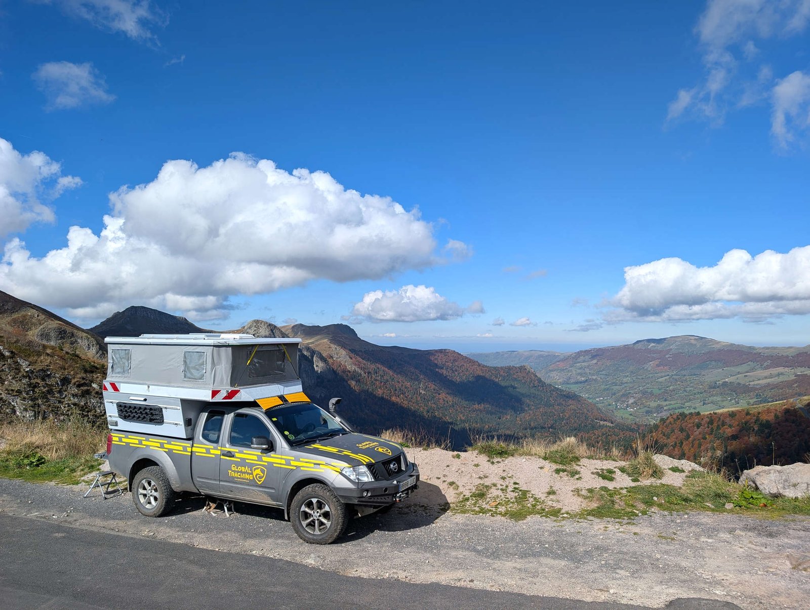 At the top was the large car park of Puy Mary, but our destination was another: the col de Redondet, a Park4Night site. It's about fifteen hundred metres high, and you can feel it in the air and in how my snorts sound. There were signs of "route barrée", but the warnings were before, so we continued. The actual cut was behind the place where we wanted to stay. Perfect. The place was a marvel: empty road, panoramic views, real silence and air that smelled of freedom with distant sheep.